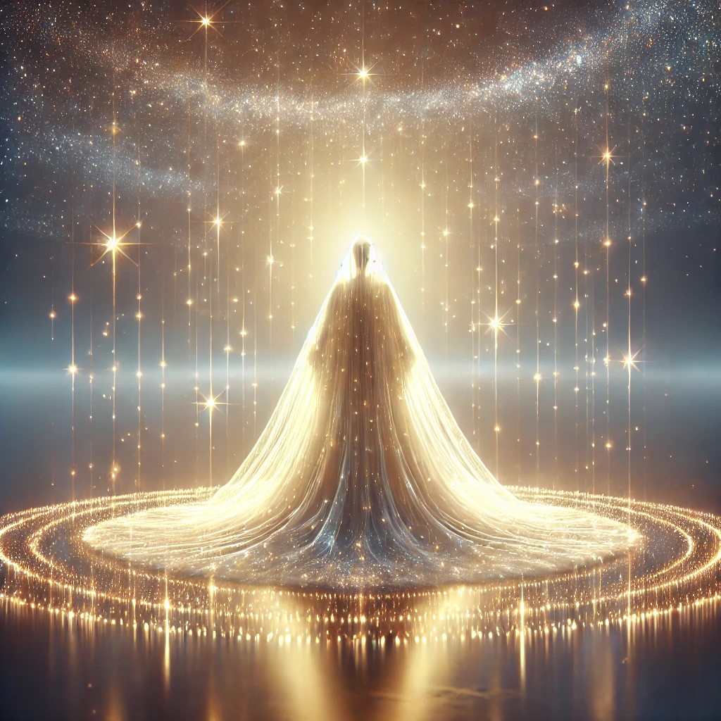 Figure stands on a radiant platform made of shimmering energy, wearing a cloak made entirely of pure light. The cloak emits a soft, warm glow, with beams of light streaming from it like rays of the sun. The light cloak is translucent and ever-changing, with hues of gold, white, and soft pastels blending seamlessly. As the figure moves, the cloak illuminates everything around them, casting gentle light on the surrounding space.
