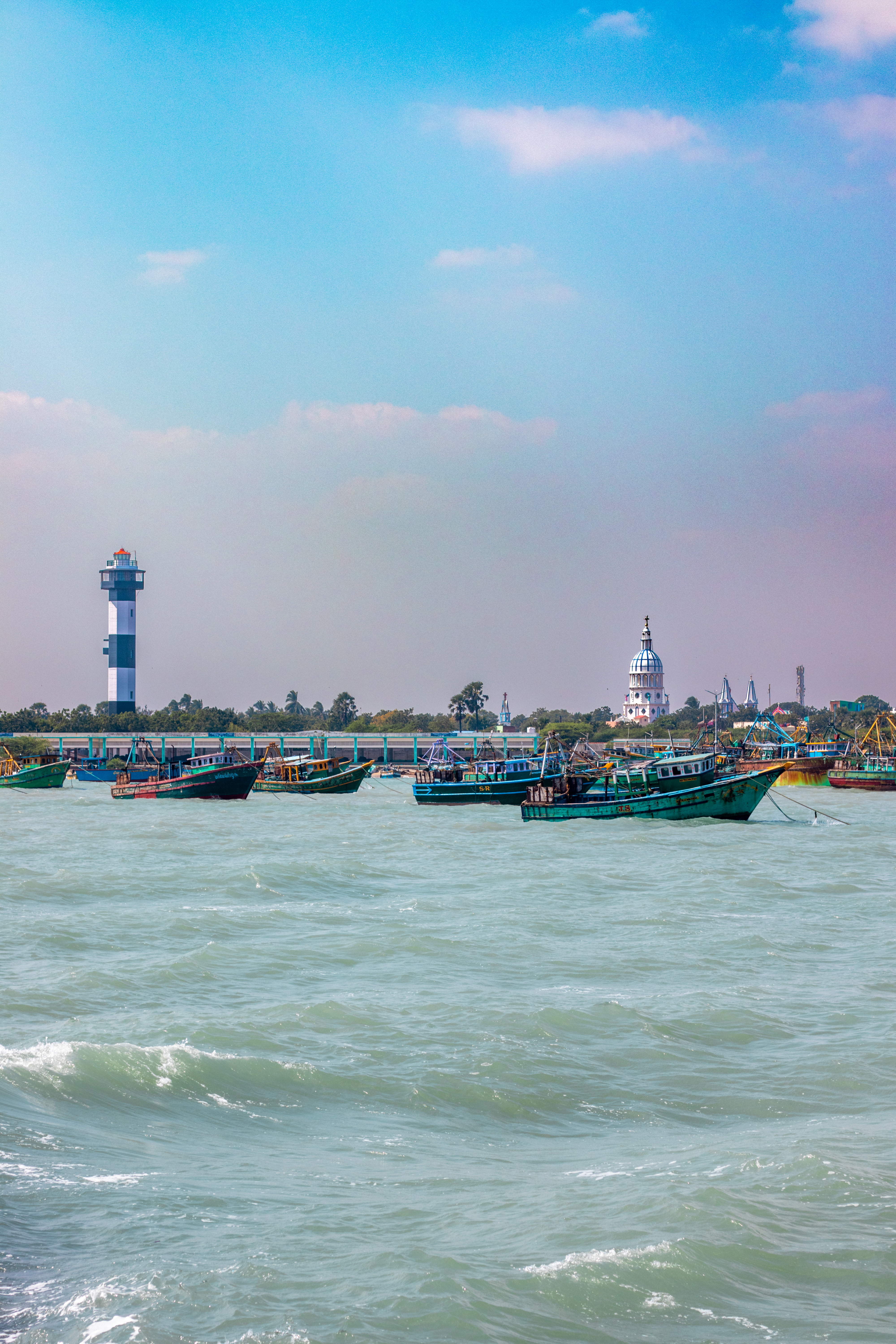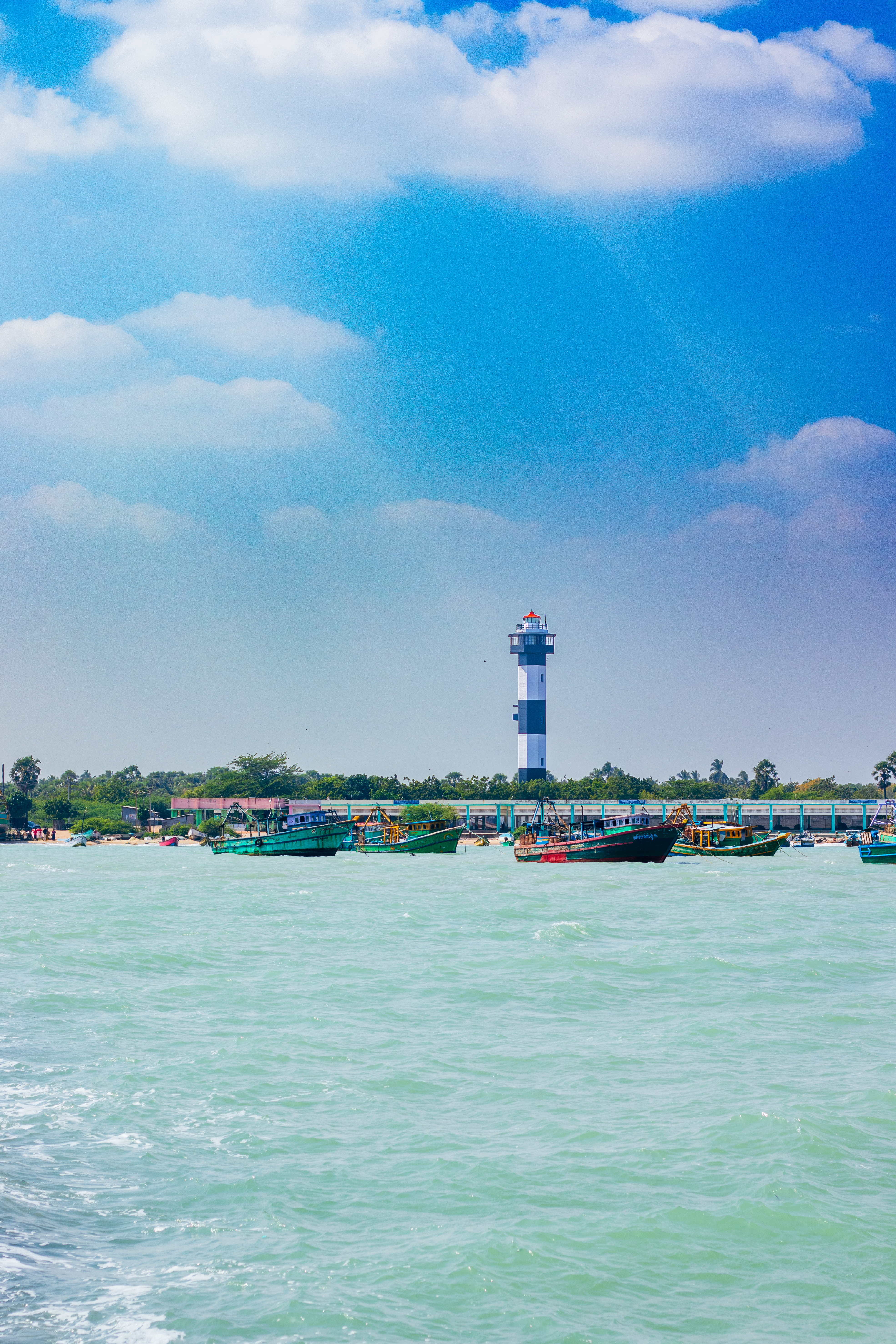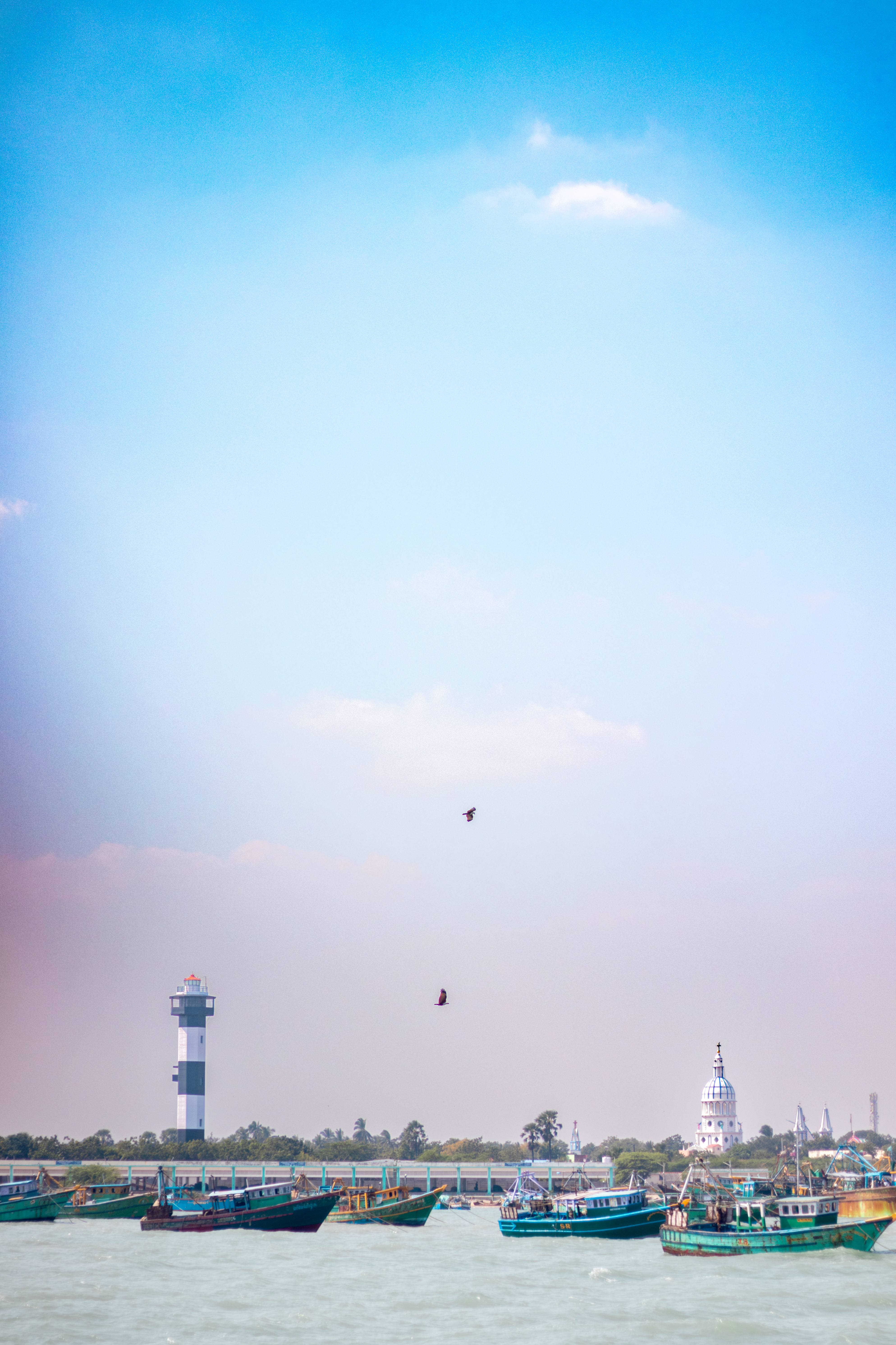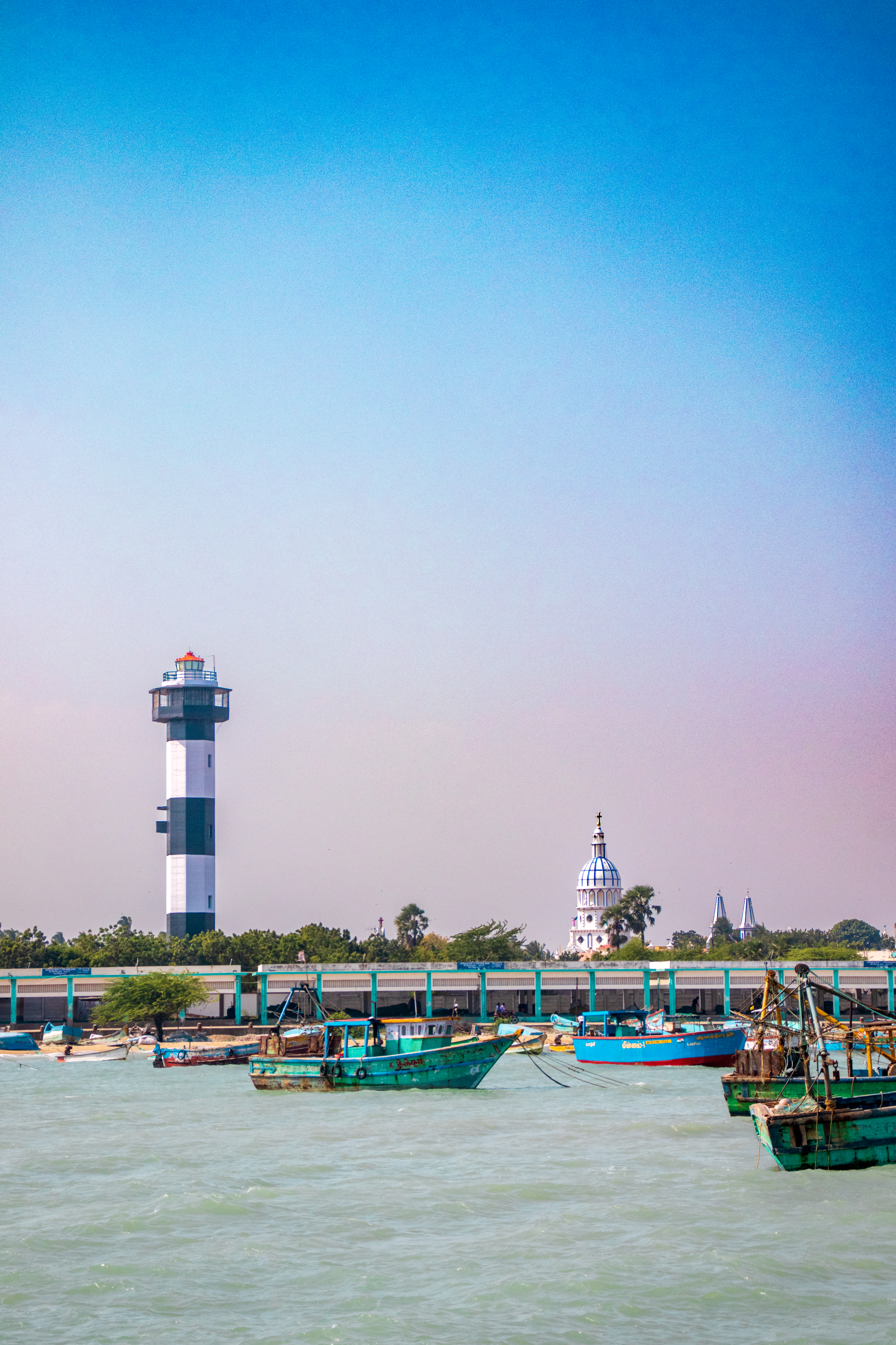 Capture the serene beauty of a coastal harbor with this captivating photograph. In the foreground, a historic lighthouse stands tall, its weathered facade a testament to the passage of time. Beyond, colorful fishing boats gently bob in the calm waters, their reflections creating mesmerizing patterns. This image evokes a sense of tranquility and nostalgia, making it perfect for a variety of design projects, from travel brochures to inspirational posters.