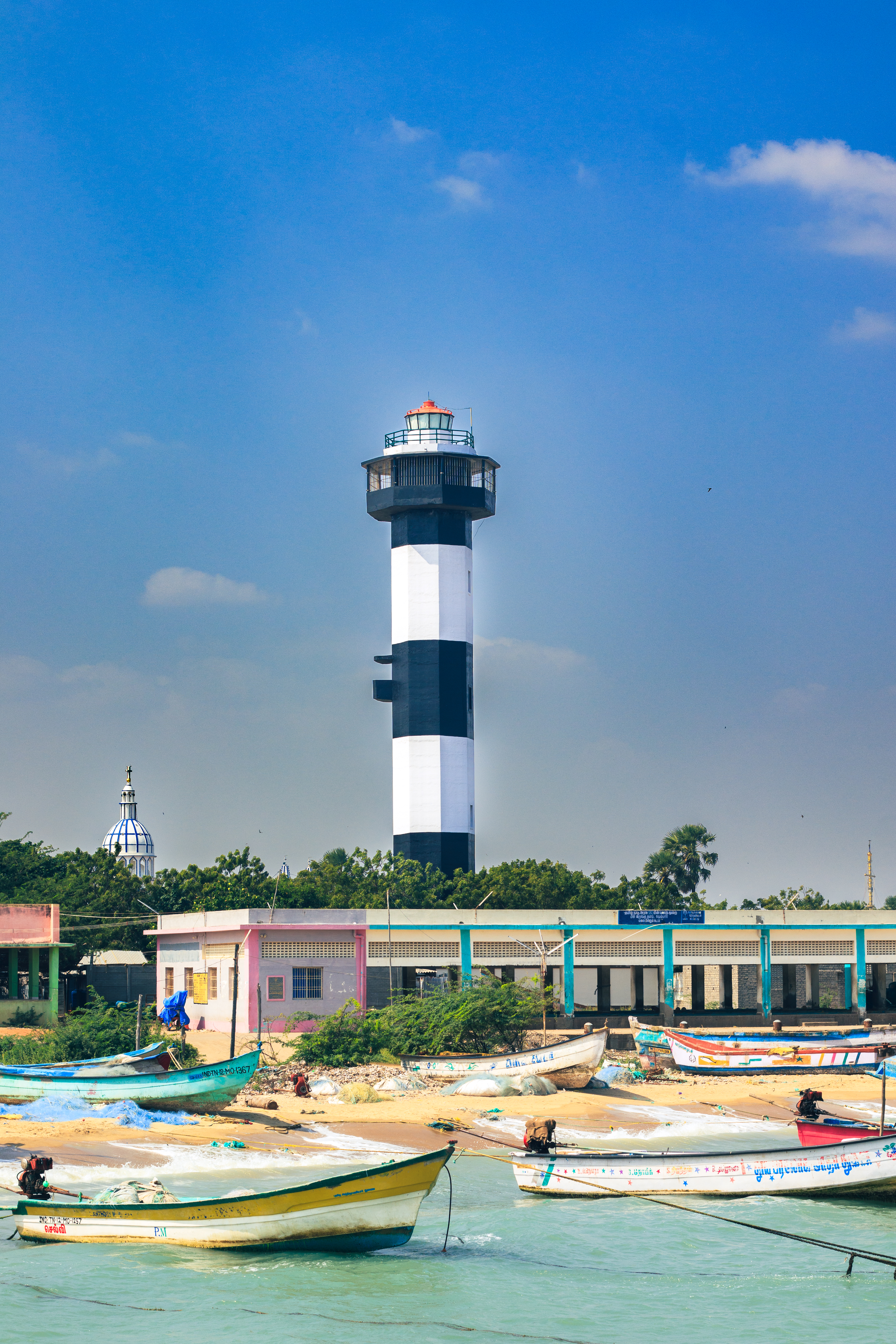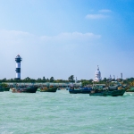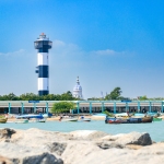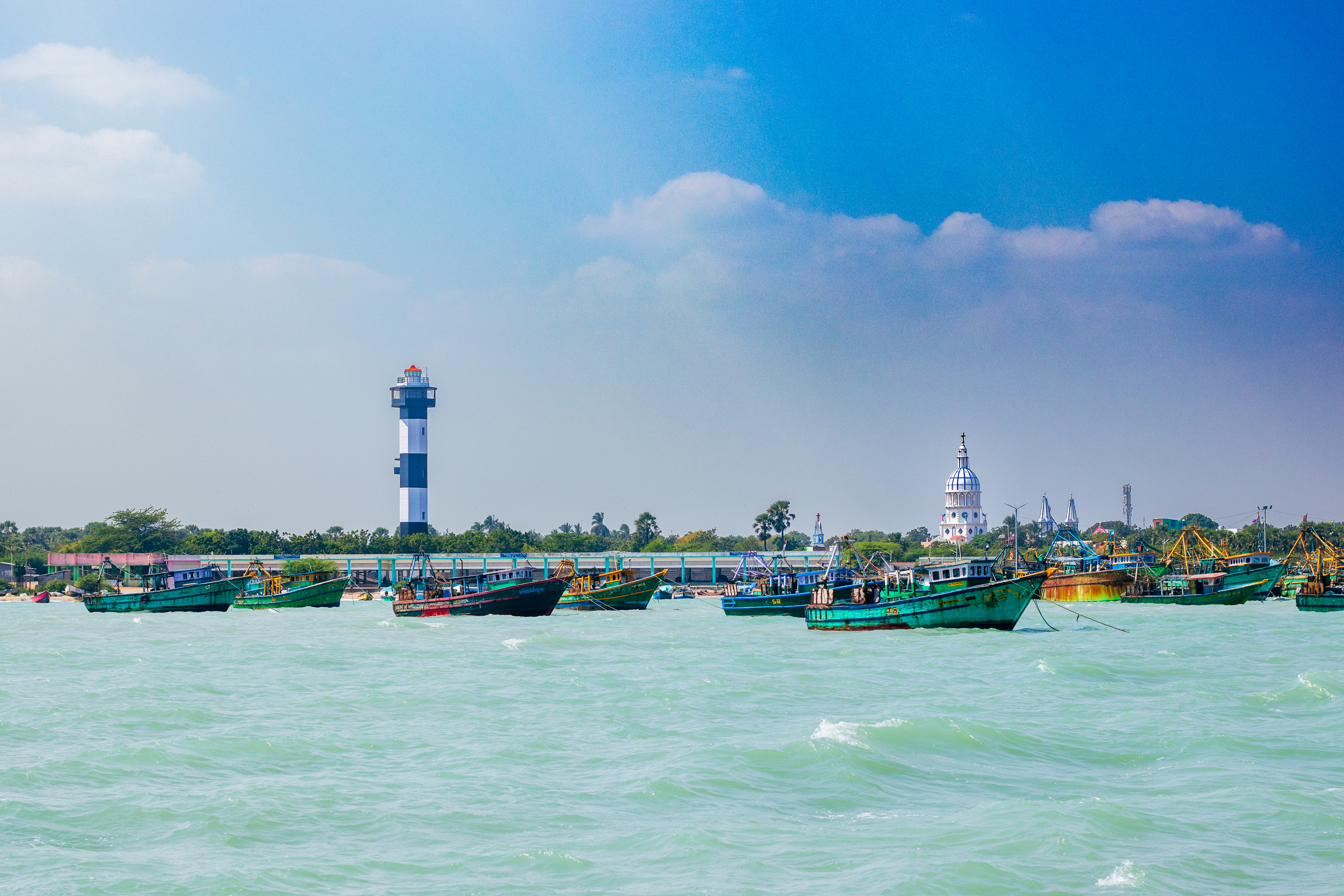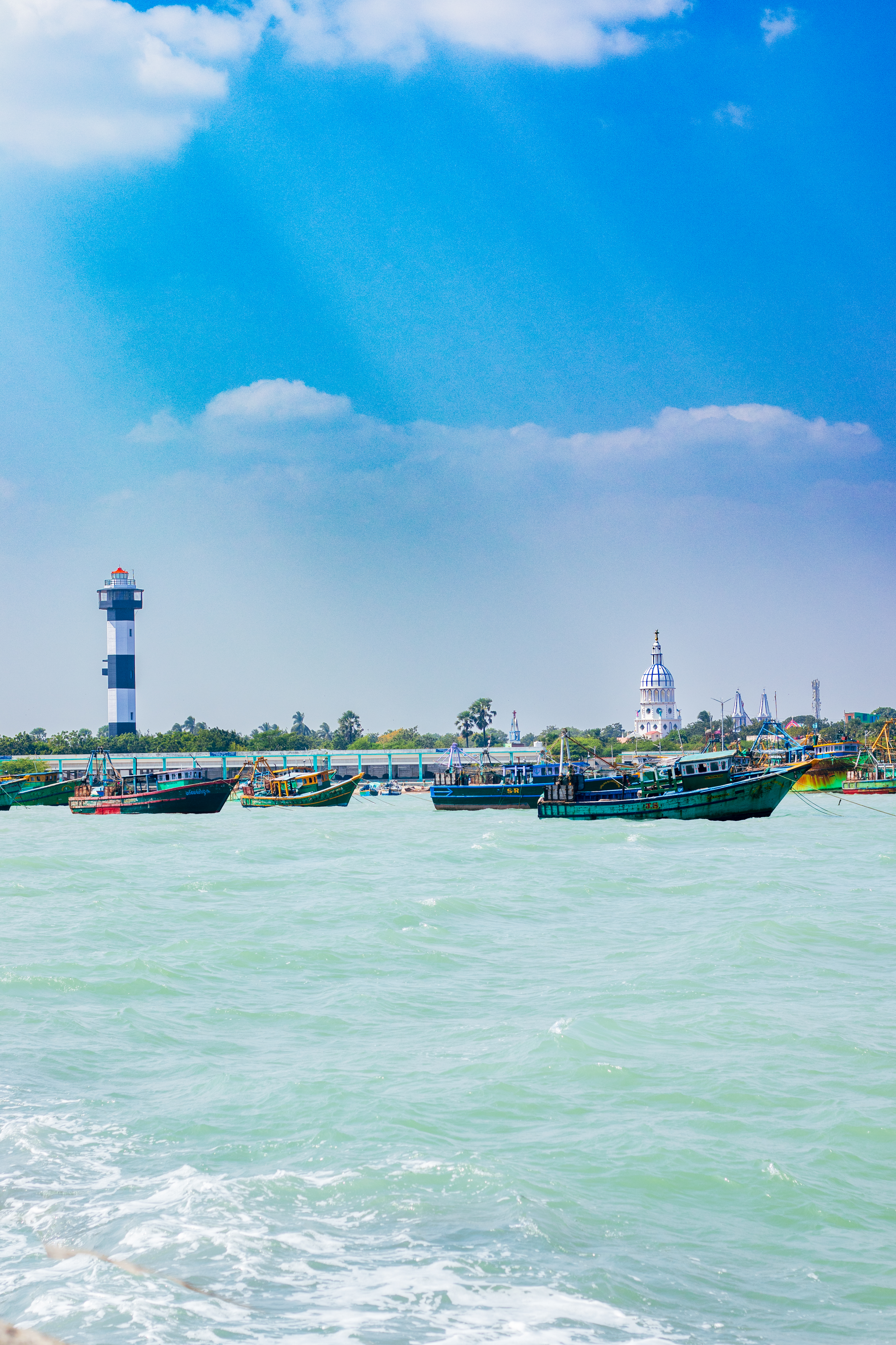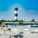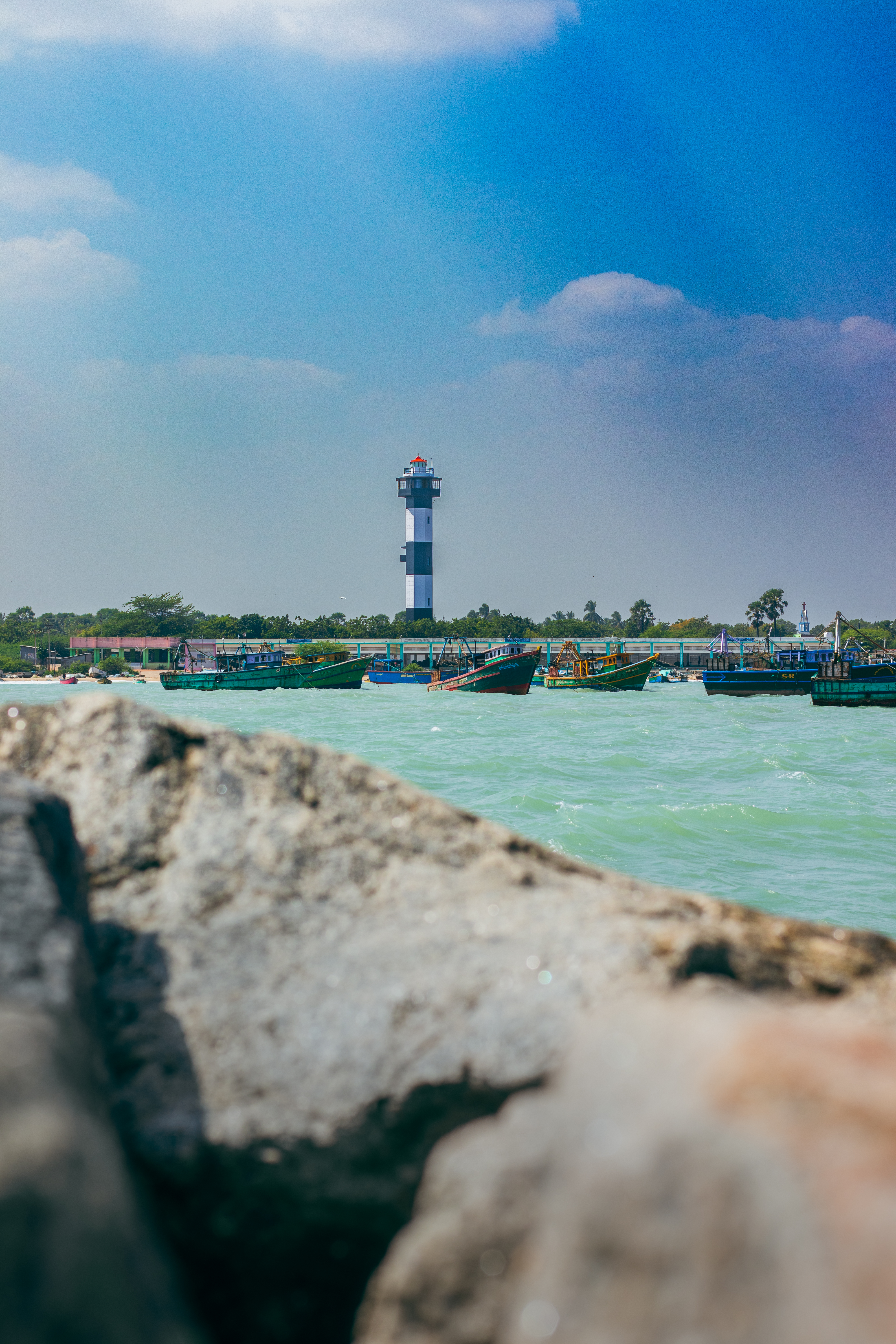 Capture the serene beauty of a coastal harbor with this captivating photograph. In the foreground, a historic lighthouse stands tall, its weathered facade a testament to the passage of time. Beyond, colorful fishing boats gently bob in the calm waters, their reflections creating mesmerizing patterns. This image evokes a sense of tranquility and nostalgia, making it perfect for a variety of design projects, from travel brochures to inspirational posters.