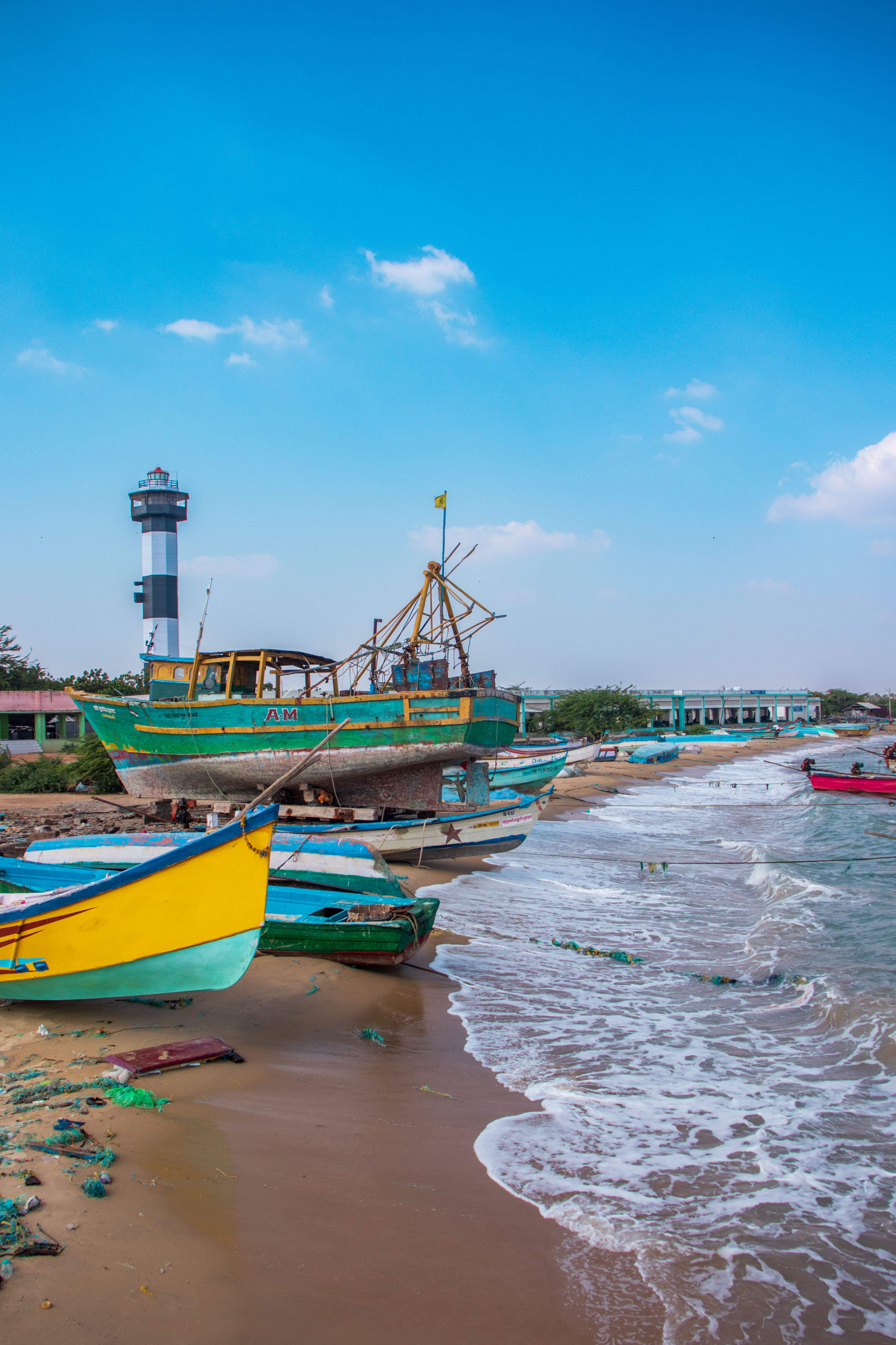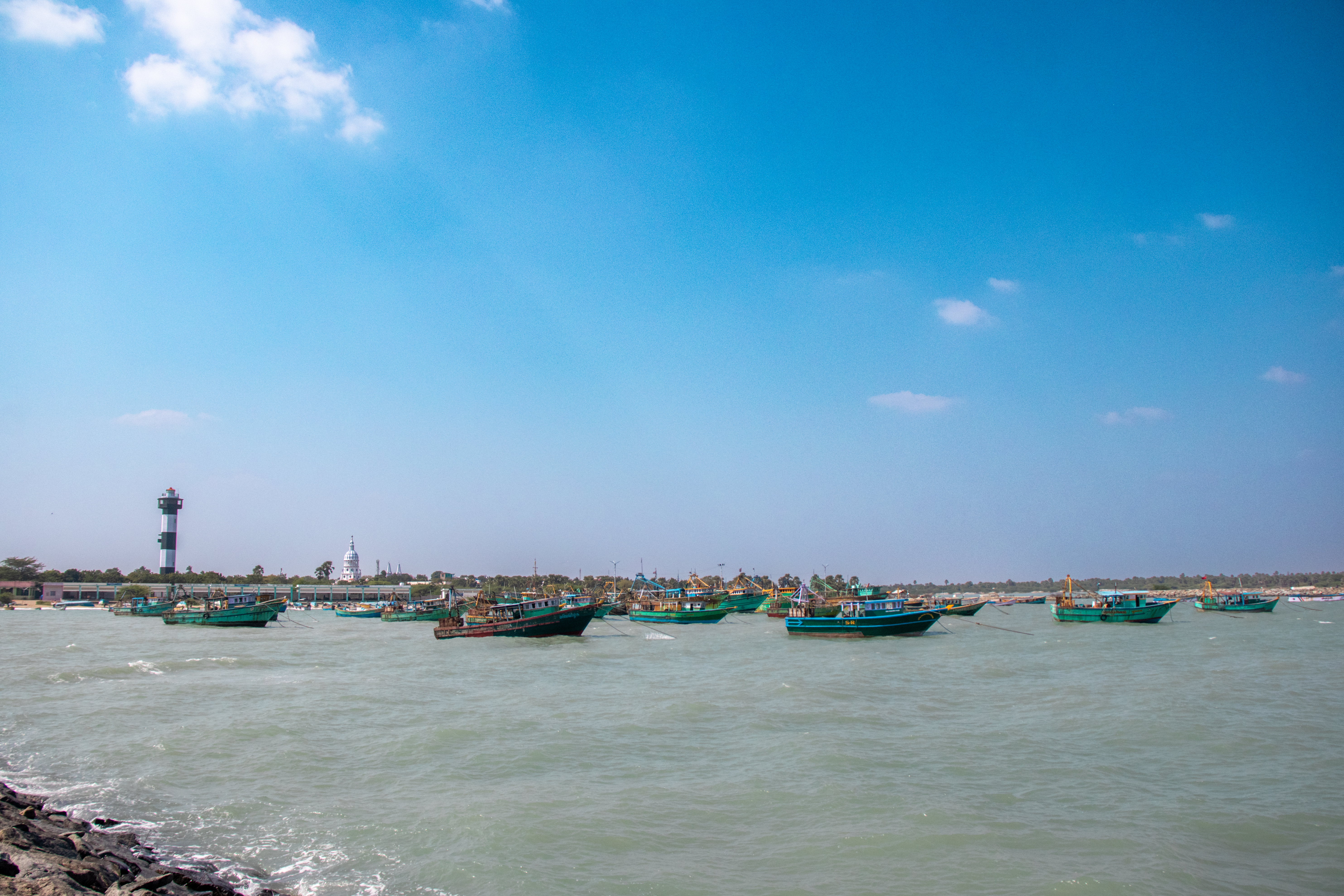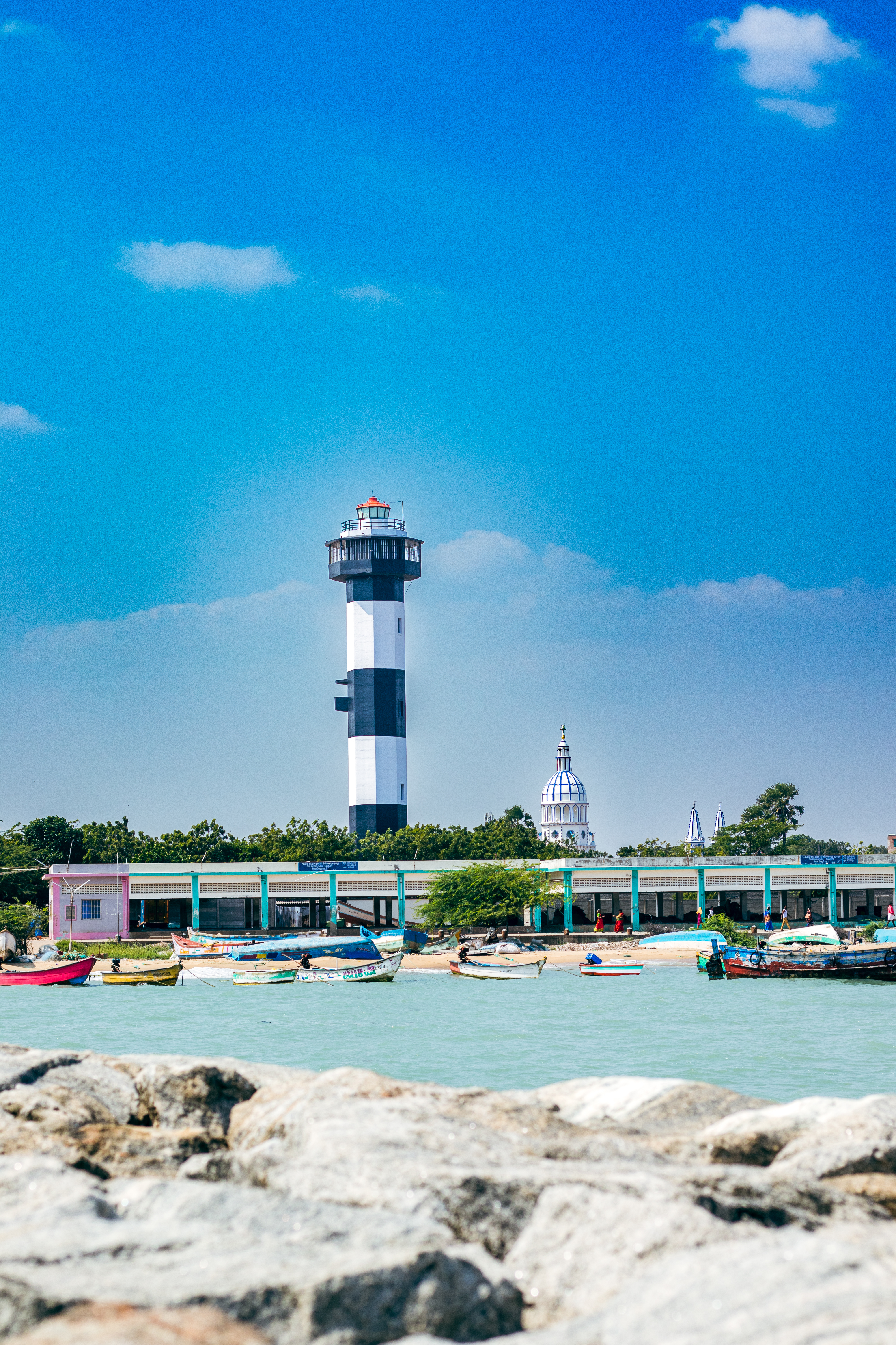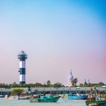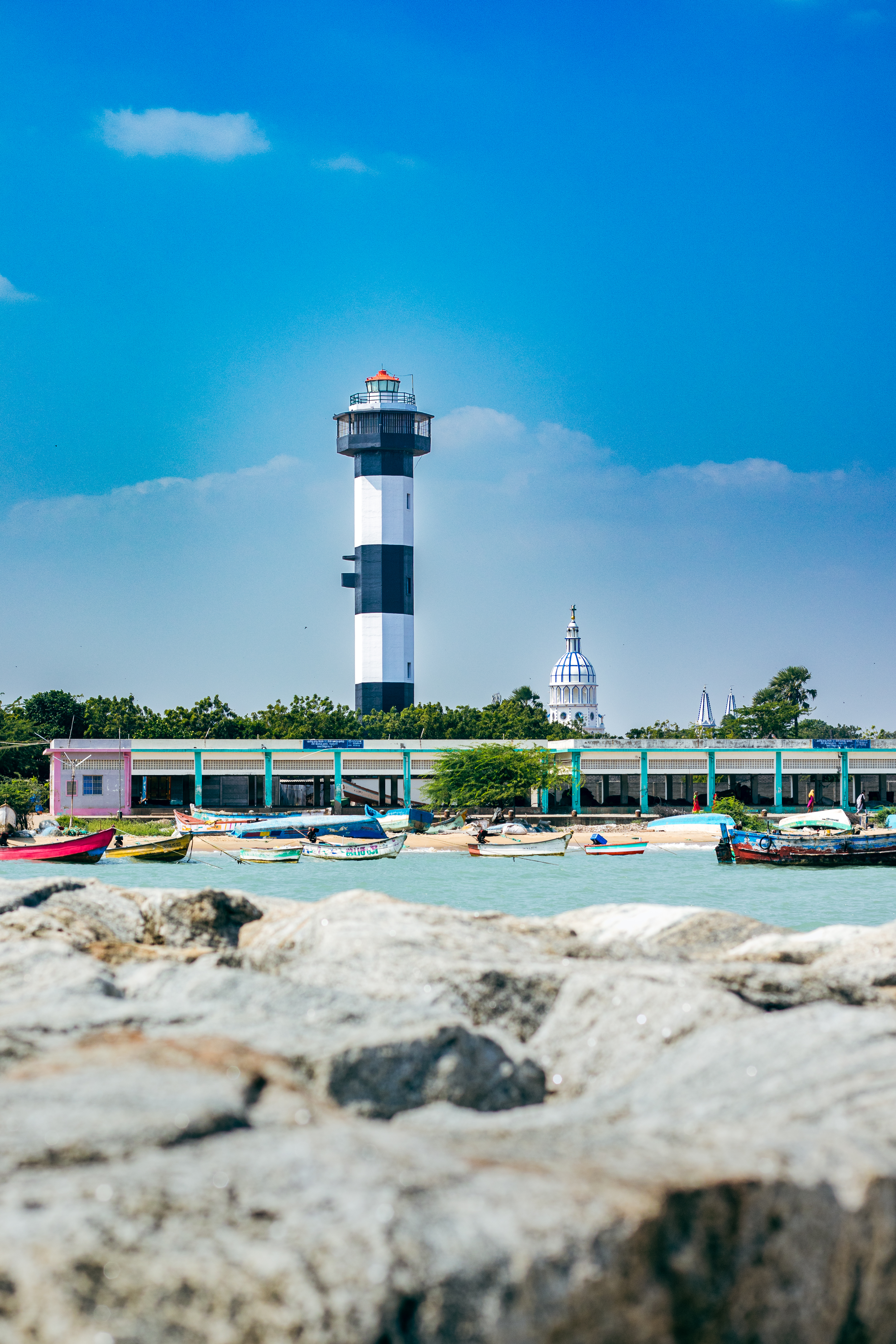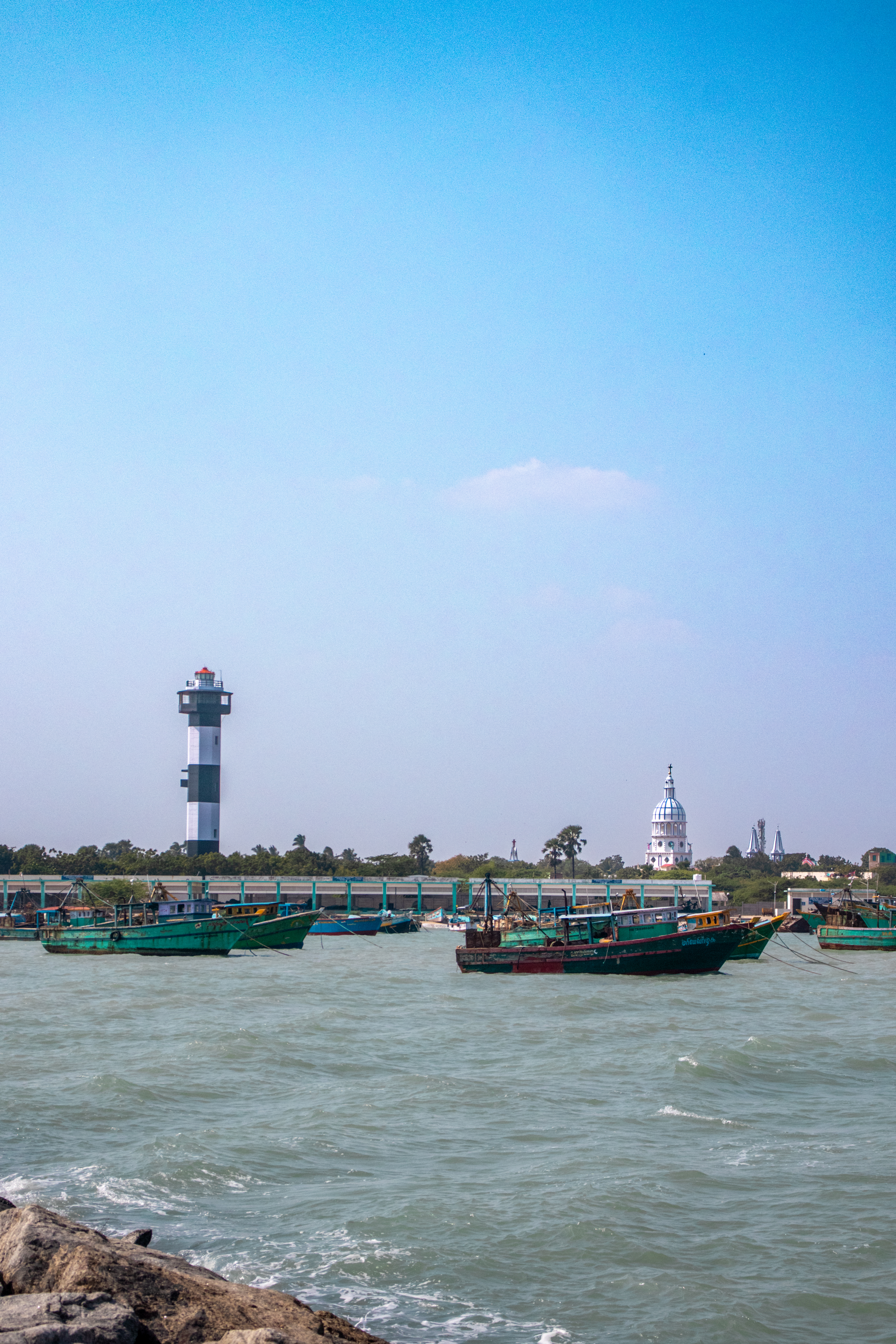 Capture the serene beauty of a coastal harbor with this captivating photograph. In the foreground, a historic lighthouse stands tall, its weathered facade a testament to the passage of time. Beyond, colorful fishing boats gently bob in the calm waters, their reflections creating mesmerizing patterns. This image evokes a sense of tranquility and nostalgia, making it perfect for a variety of design projects, from travel brochures to inspirational posters.