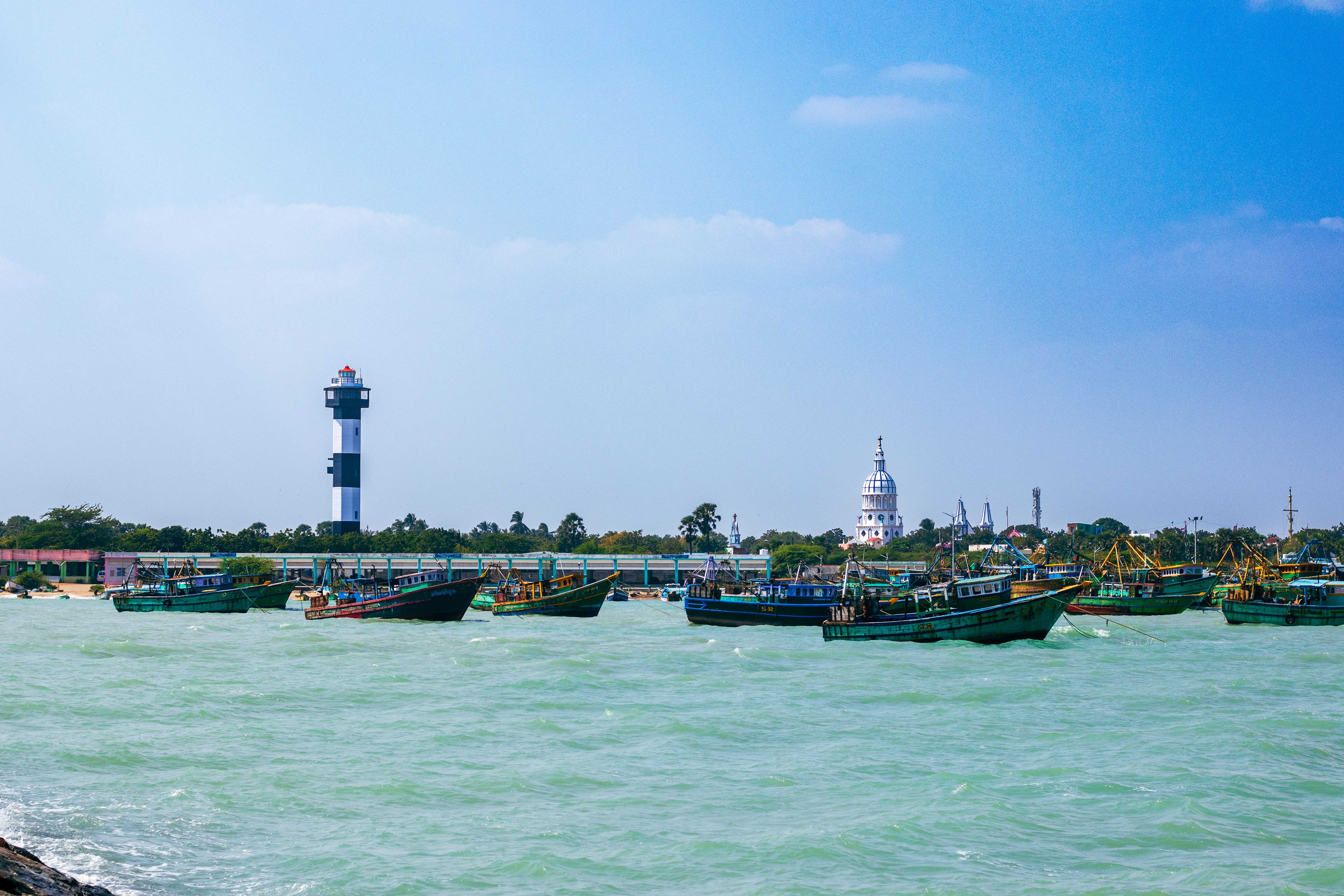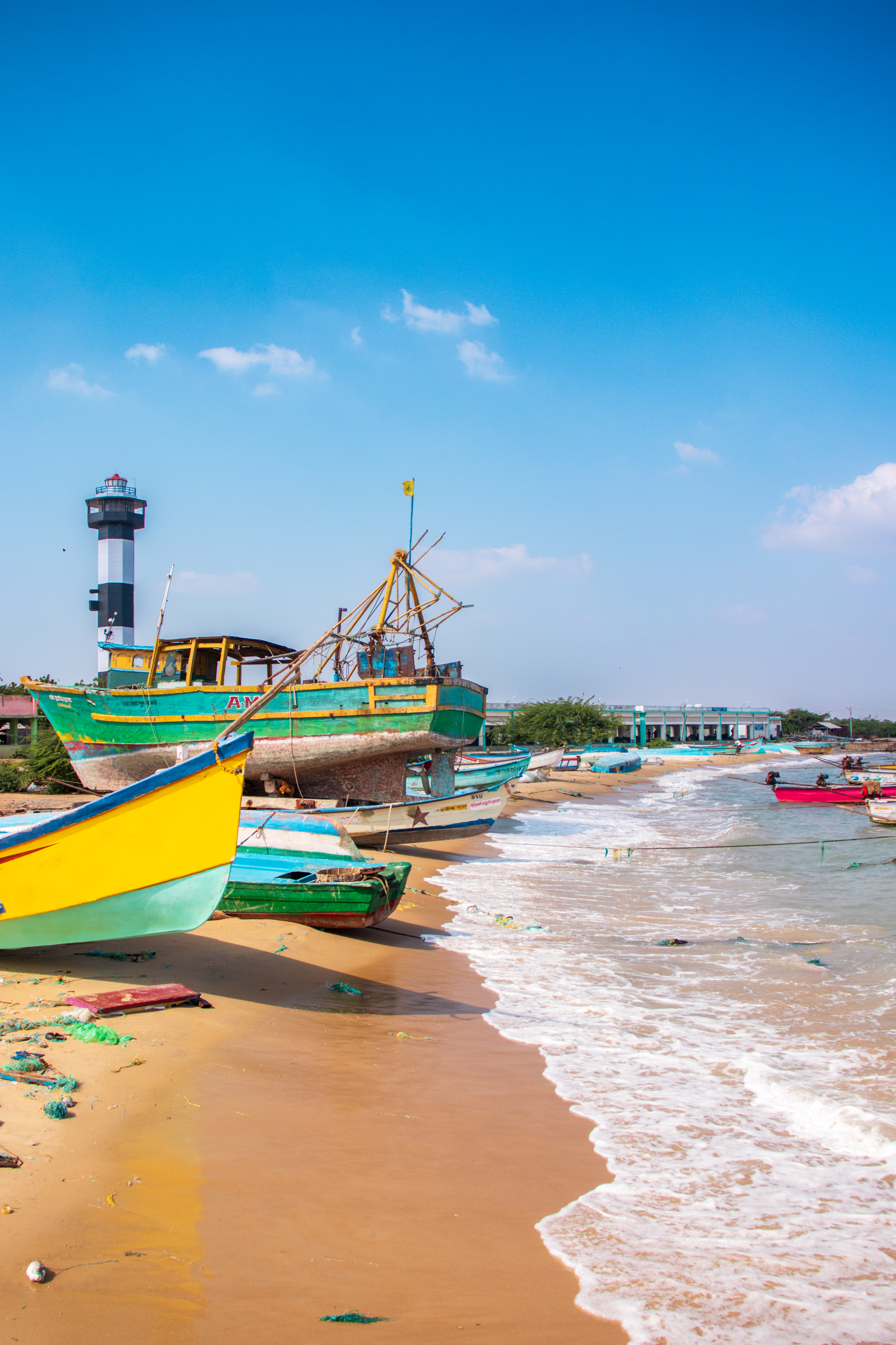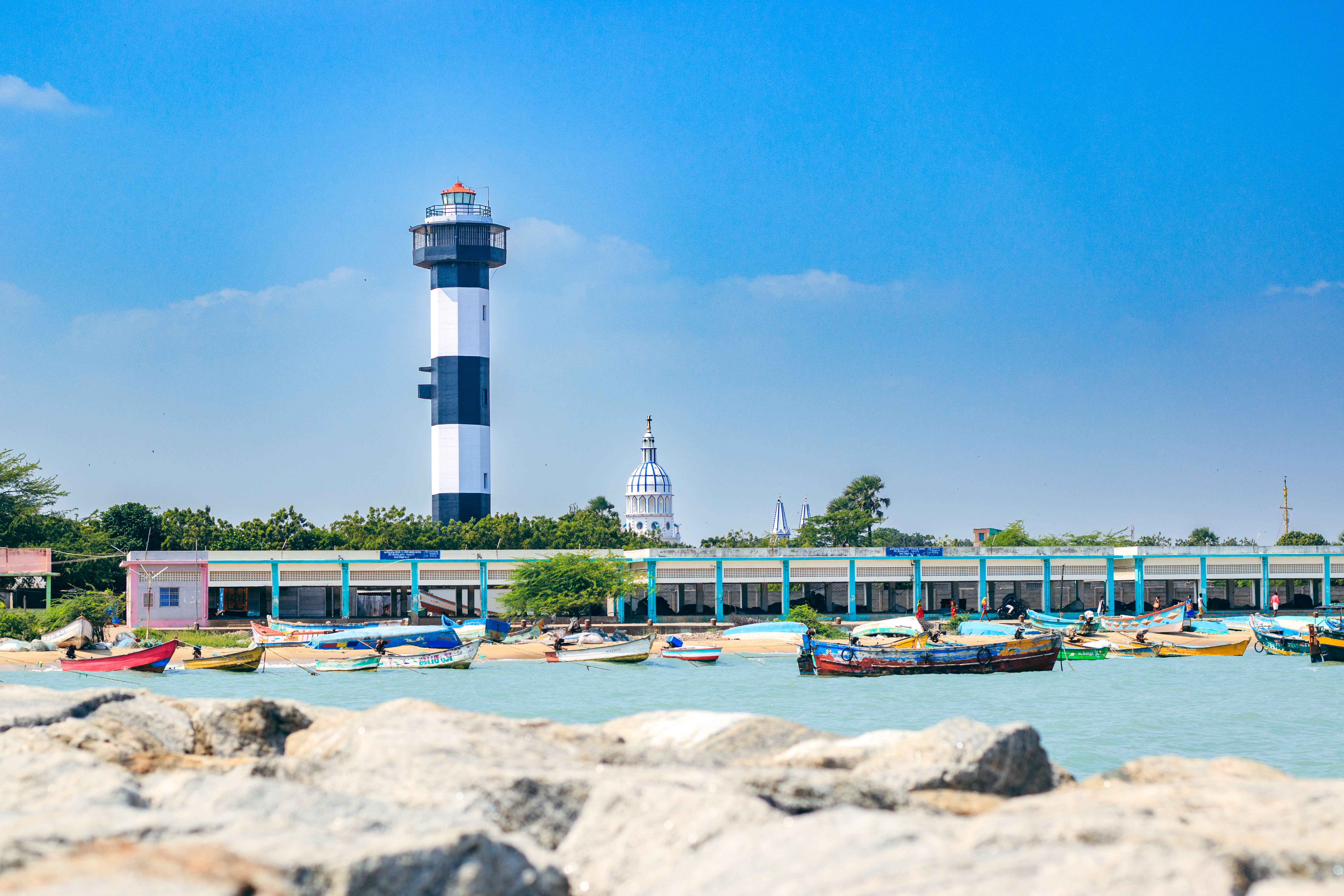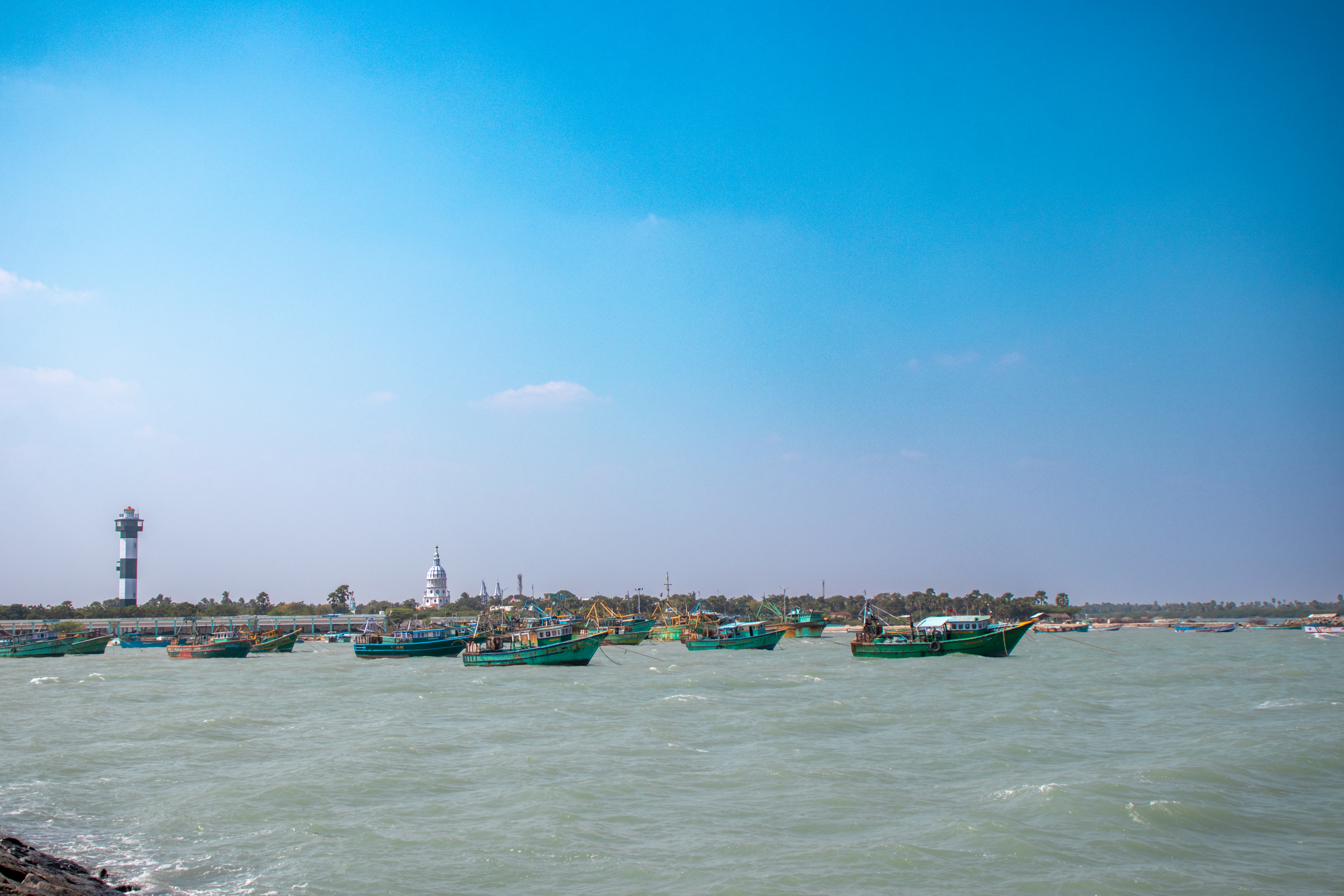 Capture the serene beauty of a coastal harbor with this captivating photograph. In the foreground, a historic lighthouse stands tall, its weathered facade a testament to the passage of time. Beyond, colorful fishing boats gently bob in the calm waters, their reflections creating mesmerizing patterns. This image evokes a sense of tranquility and nostalgia, making it perfect for a variety of design projects, from travel brochures to inspirational posters.
