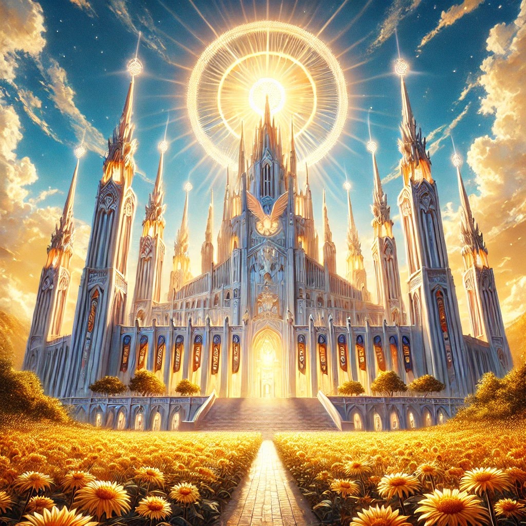 A Light Magic School stands majestically atop a sunlit hill, surrounded by radiant fields of golden flowers that seem to glow with an inner light. The school is a grand structure made of gleaming white marble, with tall, slender spires that reach towards the sky, each capped with a glowing orb of light. The walls are adorned with intricate patterns that reflect the sunlight, creating a dazzling display of colors. The entrance is framed by two towering statues of winged figures, their arms raised as if holding up the sky.