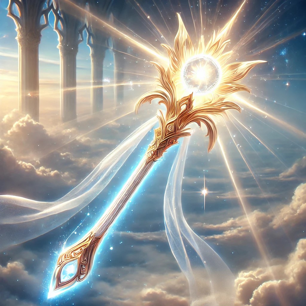 The wand is elegant and ethereal, crafted from a material that appears to be pure light, glowing softly but brightly. Its surface is smooth and radiant, with a warm, golden hue that shifts to pure white at the edges. The wand is slender and tapers to a fine point, with intricate, luminous patterns resembling sunrays or sacred geometry running along its length. At the tip, a radiant orb of light hovers, casting a gentle, divine glow that illuminates the surroundings.