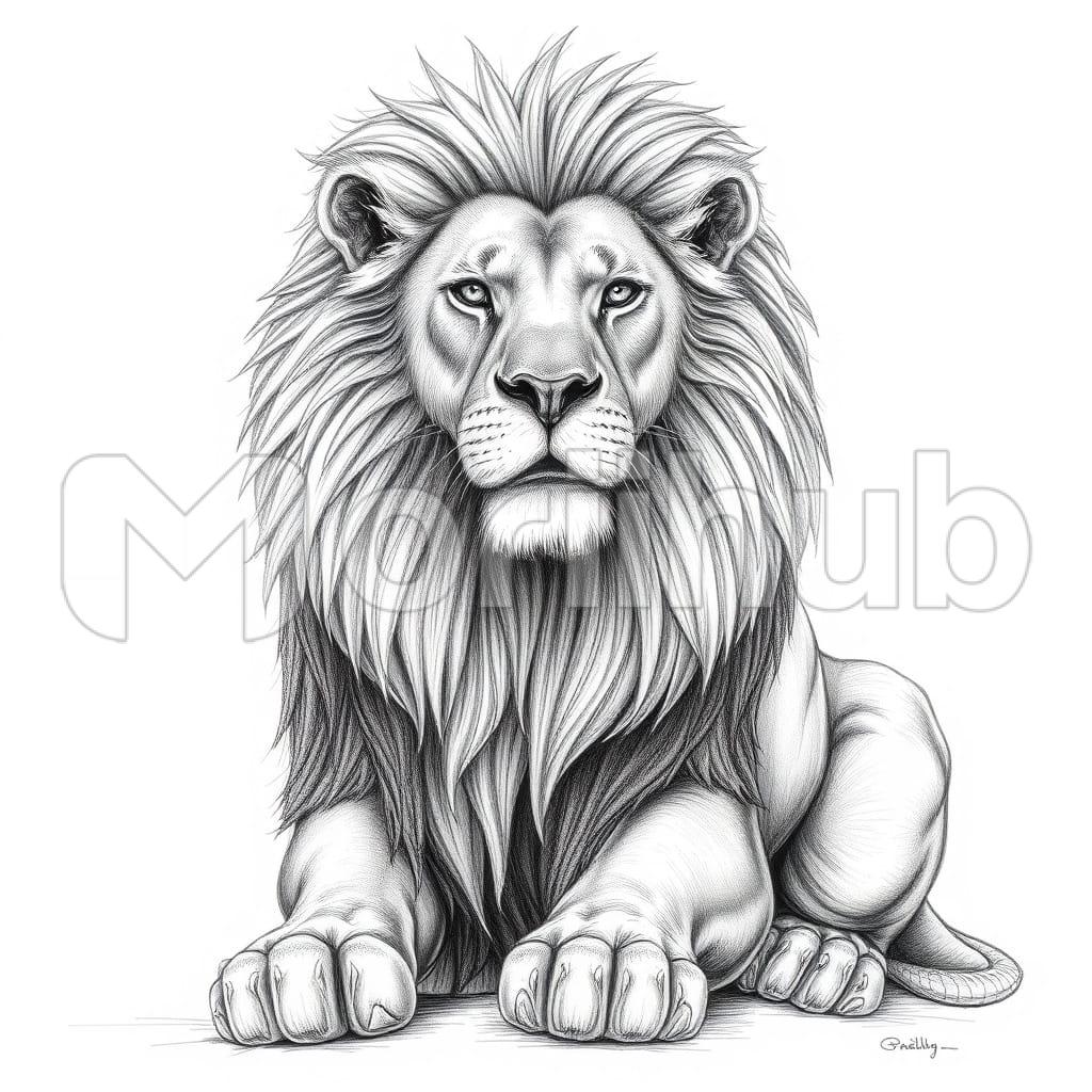 A sketch of a lion shows it sitting tall, its body outlined with steady, flowing lines. The mane spreads outward, drawn with layered strokes to suggest fullness and texture. Facial features are simple yet clear, with eyes set forward, giving a quiet and observant look. The legs are tucked close, the powerful frame resting easily while maintaining a sense of strength. The tail wraps lightly around the side, ending with a soft flick. Minimal shading adds depth without crowding the image, creating a calm, balanced portrayal of the lion in a relaxed, seated position.