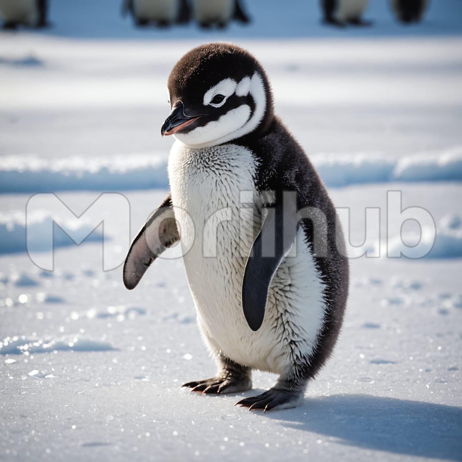 A cute baby penguin stands with wide, curious eyes, looking ahead with a soft, inquisitive expression. Its fluffy down feathers, soft and light, cover its small body, giving it an irresistibly huggable appearance. The penguin’s tiny flippers are close to its sides, and its round, chubby form adds to its charm. With a slight tilt of its head, it seems to study its surroundings, unaware of how utterly adorable it is. The scene is peaceful, with the baby penguin’s innocence and curiosity shining through.