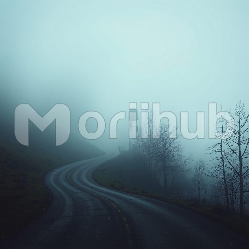 A narrow road stretches into the distance, veiled in light mist that softens its edges. The surface appears damp, though no rain falls. On one corner, bare trees stand still, their branches thin and angular against the haze. The muted tones of the scene give no sense of time or sound. Faint outlines of more trees blur into the background, swallowed by the gray air. No sign of movement appears along the stretch. The atmosphere holds quiet weight, the road continuing forward with no clear end in sight.