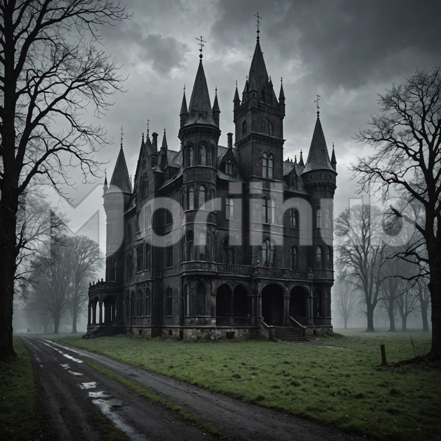 A house stands by the side of the path, its structure worn and silent beneath the weight of an overcast sky. Bare trees surround it, their limbs stretched upward like quiet figures holding still. The path runs past, untouched, as if few pass this way. Overhead, thick clouds press low, casting the entire scene in muted tones. The house remains in its place, solitary and unmoving beneath the heavy sky and leafless trees, as if waiting without purpose, settled into the landscape with a quiet that asks for nothing.