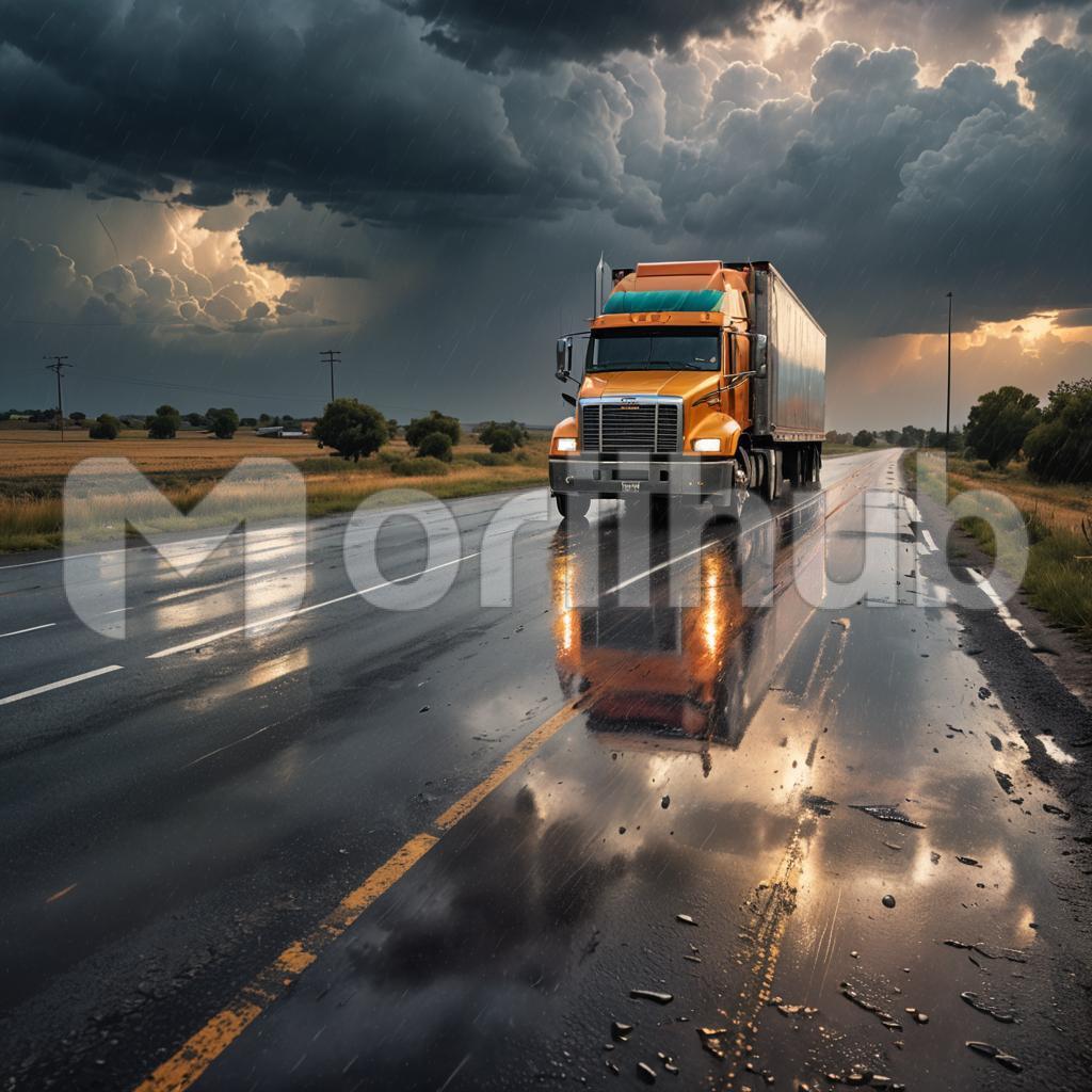 The truck’s headlights cut through the dimming light of dusk, casting a steady beam ahead as it moves steadily down the road. The highway stretches out endlessly, bordered by expansive fields or rolling hills that seem to merge with the horizon. The truck’s cargo area is silhouetted against the fading sky, hinting at the important journey it is undertaking. As the road winds gently, the occasional flicker of a distant roadside sign or a lone tree adds to the sense of solitude and determination.