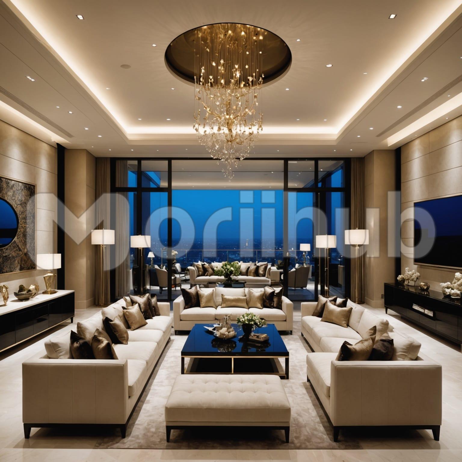 The living room exudes comfort and functionality, with couches arranged to create an inviting seating area. A coffee table rests at the center, offering space for essentials or décor. Mounted on the wall, a TV stands turned off, blending seamlessly with the surroundings. Lamps are placed strategically around the room, their presence ready to cast a soft glow when illuminated. The layout strikes a balance between style and relaxation, with every element contributing to a welcoming atmosphere ideal for gathering, unwinding, or simply enjoying the quiet ambiance.