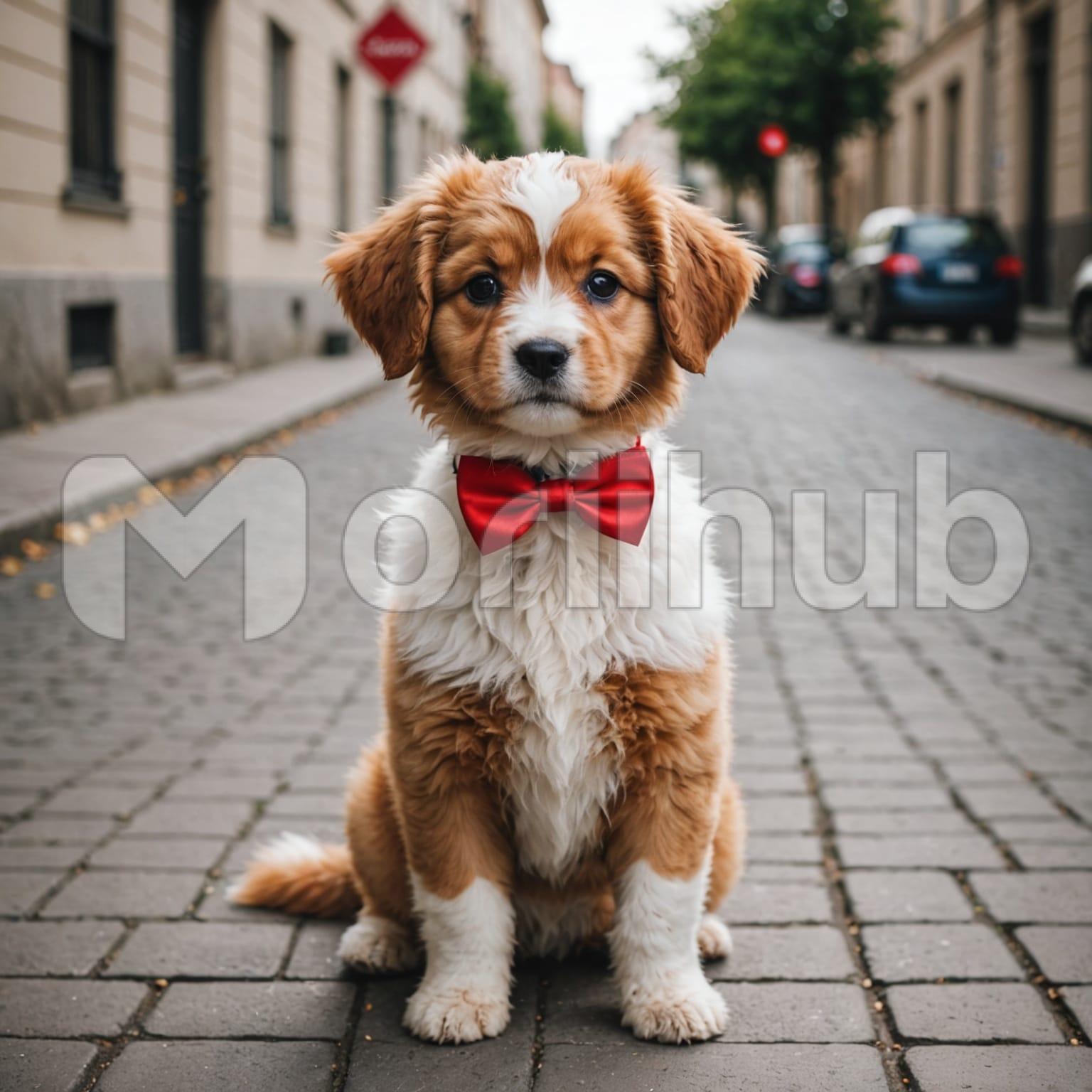 A dog sits on the street, its ears drooped gently to the sides. A small bow tie rests neatly around its neck, giving it a composed and endearing look. Its posture is calm, steady, and patient, as though it’s quietly taking in its surroundings. The street extends behind, faint details suggesting quiet activity. There’s an understated charm in its stillness, the bow tie adding a touch of character. The scene feels simple yet full of presence, capturing a moment of quiet companionship.
