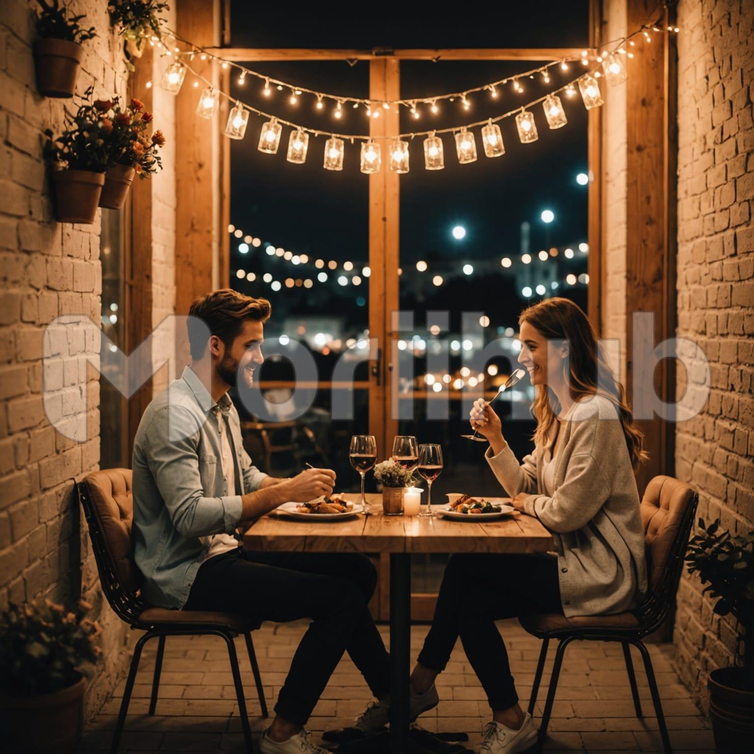 A cozy evening unfolds as lovers share a candlelit dinner, surrounded by soft music and the scent of fresh roses. The table glows under warm lights, their laughter mingling with the gentle clink of glasses — a night of warmth, affection, and quiet magic.
