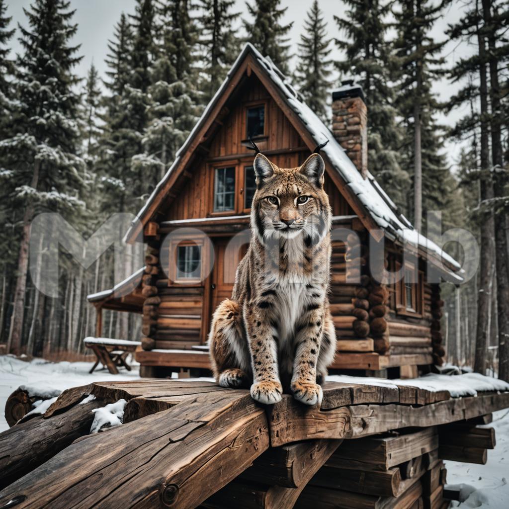 Imagine a majestic lynx perched atop a rustic cabin, its sleek fur blending with the weathered wood. Against a backdrop of towering pines and a serene mountain vista, this wildcat embodies the untamed spirit of the wilderness. Its piercing gaze and poised stance create a striking contrast, where primal instincts meet human habitation in a harmonious yet awe-inspiring encounter with nature.