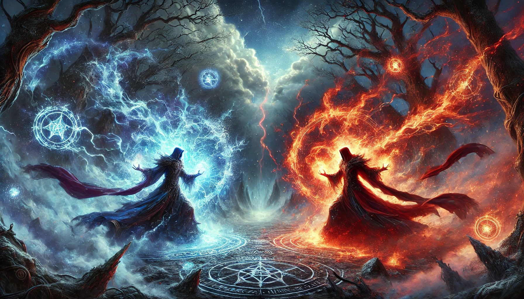 “An intense mage battle unfolds in a mystical and ancient forest. Two powerful mages stand opposite each other, each surrounded by swirling magical energies. One mage, cloaked in deep blue robes, casts a spell that conjures a torrent of icy shards, while the other, in fiery red robes, summons a blazing inferno. The spells clash in a spectacular display of light and energy, with sparks and embers flying in all directions.