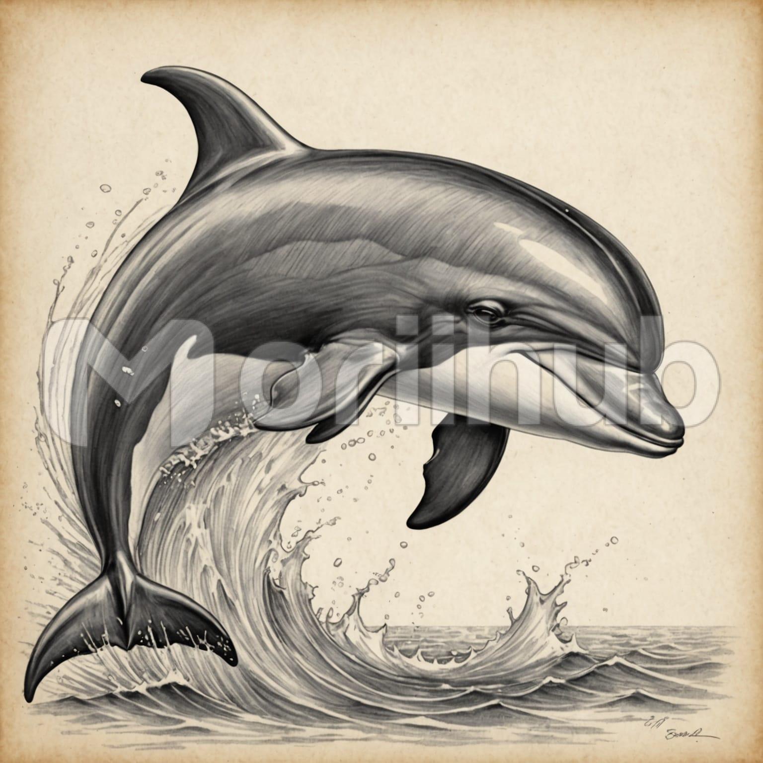 A pencil sketch depicts a dolphin gracefully diving into the sea, captured in fluid, sweeping lines. The dolphin’s sleek body is rendered with fine, precise strokes, creating a sense of movement and elegance. The waves beneath it are sketched with gentle, curved lines, suggesting the water’s dynamic surface. Light shading adds depth to the dolphin’s form, highlighting its streamlined silhouette against the soft, textured background. The overall composition conveys a serene yet powerful moment, showcasing the dolphin’s natural grace and the tranquil beauty of the ocean.