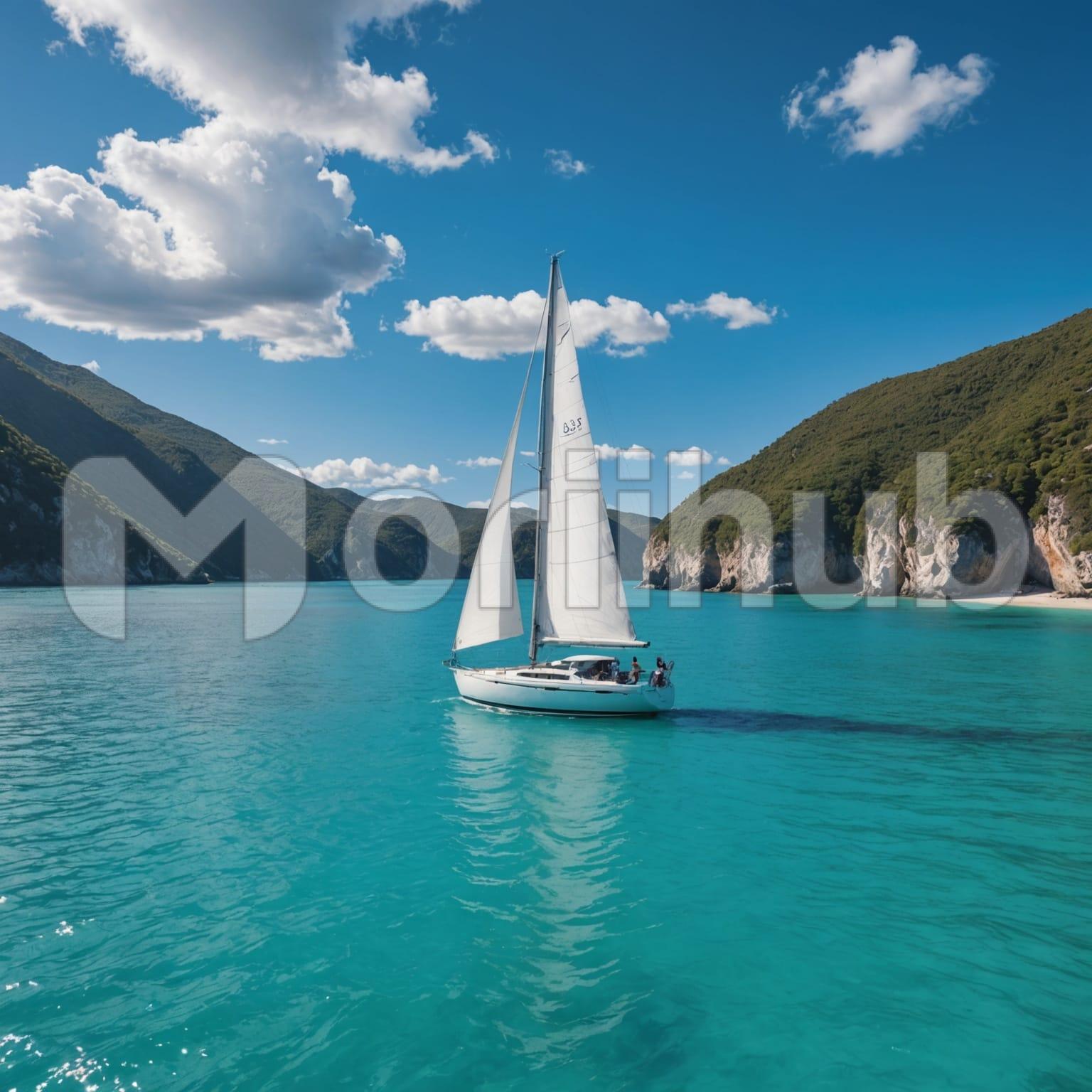 A sailboat glides smoothly over the clear sea, its sail billowing softly in the breeze. The water sparkles beneath, reflecting light like scattered glass. In the corners of the horizon, rocky hills rise with quiet strength, their rugged forms adding contrast to the open view. Overhead, clouds drift gently, their shadows touching the waves in passing. The air feels calm and bright, carrying a sense of freedom and peace. It’s a serene moment where sea, sky, and stone exist in perfect balance.
