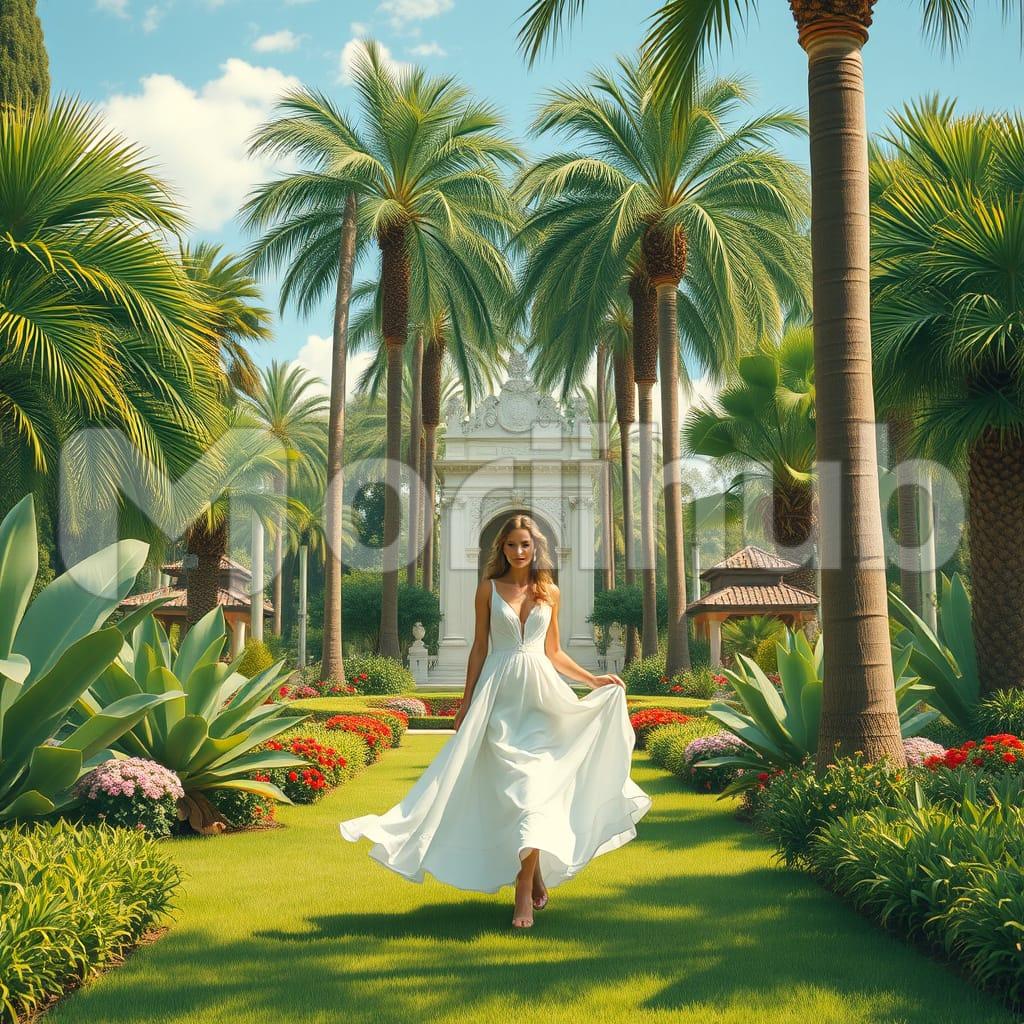 She gracefully strolled through the palm monument garden, her white gown flowing with each step. The soft breeze lifted the fabric, creating a serene dance as she wandered among the towering palms. The garden, rich with memories, seemed to embrace her, offering a peaceful, timeless moment in the embrace of nature’s beauty.