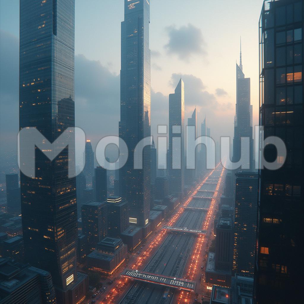 Tall skyscrapers rise on both sides of a bustling city road, their reflective surfaces capturing fragments of the surrounding skyline. The buildings create a structured path along the avenue, their heights varying slightly but all standing proudly as markers of urban life. The road stretches ahead, framed by the grand architecture that defines the city. Overhead, clouds drift lazily across the sky, casting soft shadows that move over the towering buildings, adding depth to the cityscape and enhancing the urban atmosphere.
