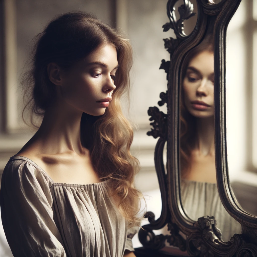 In the tranquil embrace of her chamber, a woman stands before a grand, ornate mirror, lost in contemplation. Her reflection gazes back with a quiet intensity, revealing depths of thought and emotion. In the mirror’s polished surface, she seeks not just her own visage, but also glimpses of her soul’s journey, pondering life’s mysteries and her place within them.