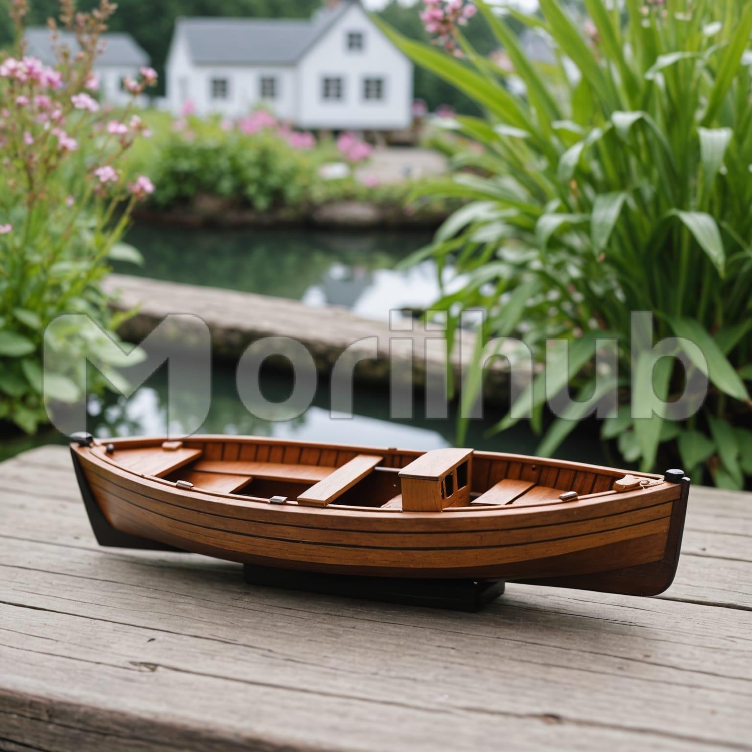 A miniature wooden canoe rests on a plain surface, its form smooth and neatly shaped. The body curves gently from front to back, with the sides rising slightly in a clean, simple outline. The wood grain appears in light, natural lines, giving a soft, quiet detail to the small structure. No paddles or extra objects surround it, keeping the focus on the canoe itself. The scene stays calm and uncluttered, shaped by the steady form of the small, well-crafted wooden canoe.