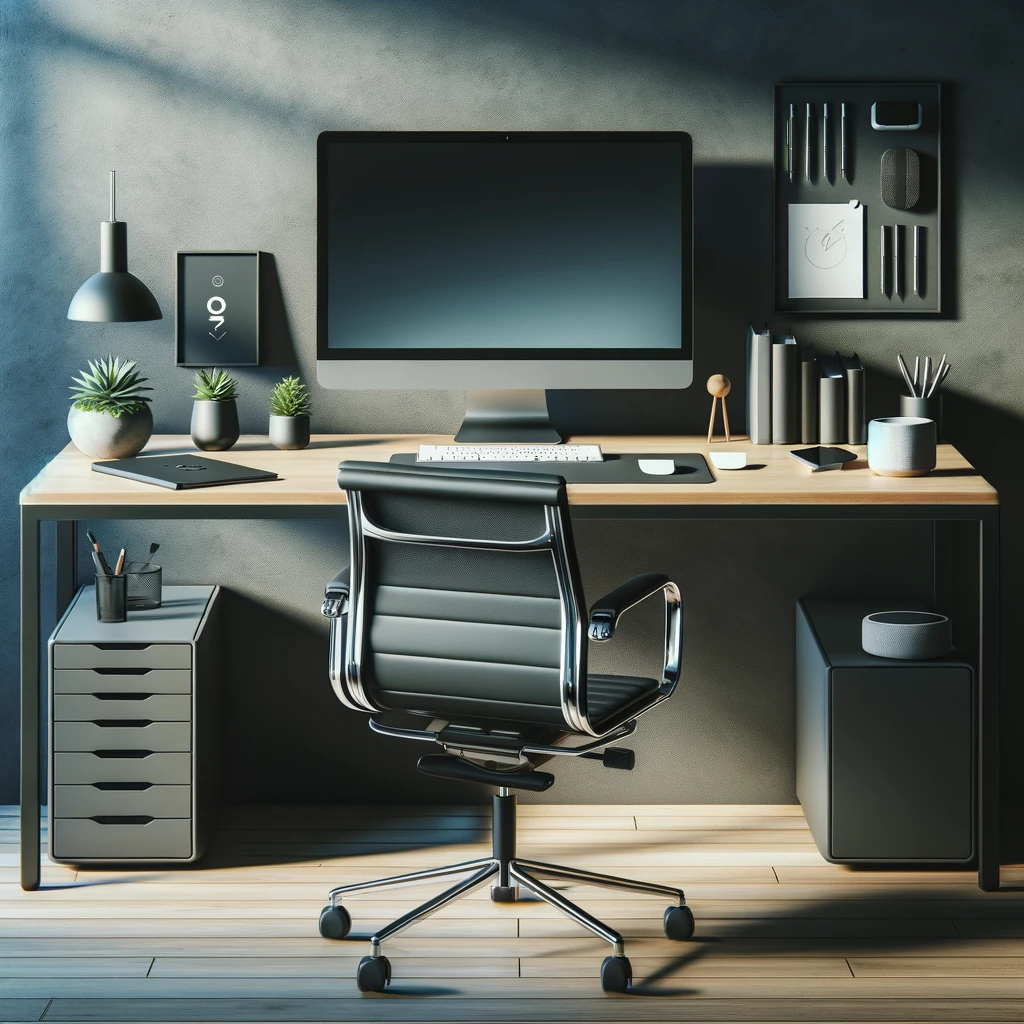 At this sleek, modern office desk, productivity and organization take center stage. Its spacious surface, adorned with clean lines and minimalist aesthetics, invites focus and clarity of thought. Every detail, from the neatly arranged stationery to the ergonomic chair, is meticulously curated to enhance efficiency and comfort, fostering a conducive environment for creative endeavors and professional excellence.
