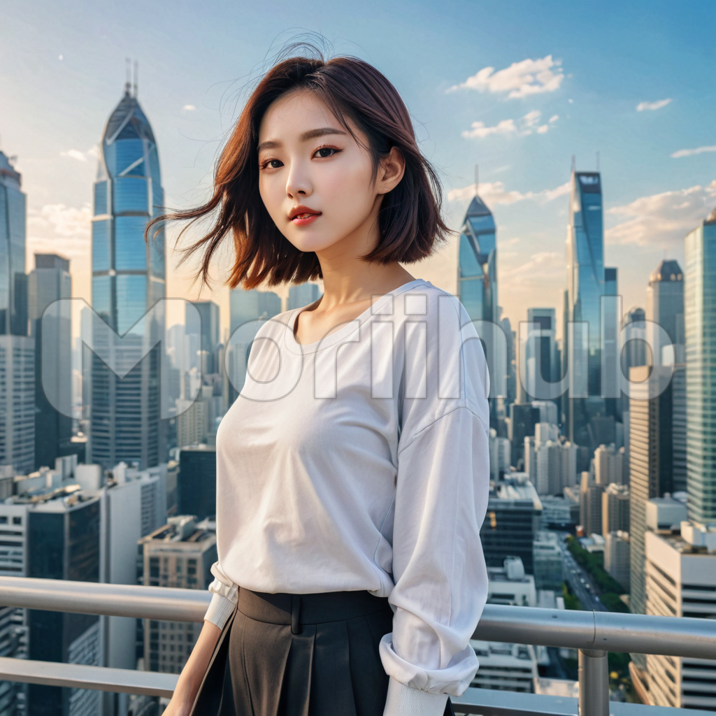 A beautiful woman stands against the backdrop of a sprawling cityscape, her gaze fixed intently on the horizon. Her elegant posture and serene expression suggest both determination and contemplation. The city behind her bustles with life; towering skyscrapers reach towards the sky, their glass facades gleaming in the light. Amidst this urban expanse, she stands out—a calm presence amidst the chaos. Her appearance is striking yet poised, embodying a blend of modern sophistication and timeless grace, perfectly complementing the dynamic city that unfolds behind her.