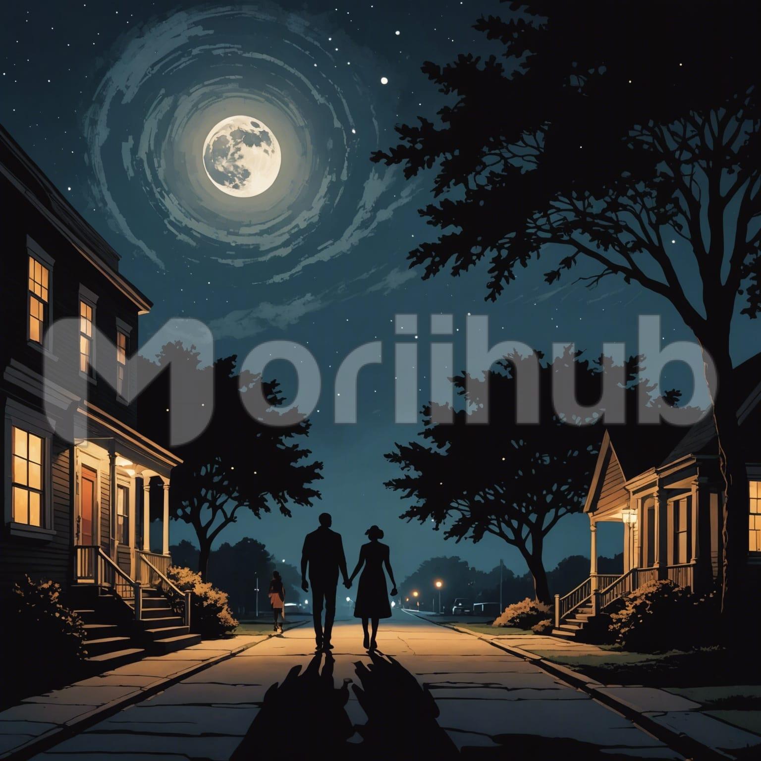 Under the moon’s gentle glow, a silhouette of a couple strolls hand in hand down the quiet street. Their figures meld into the night, illuminated only by the soft lunar light. With each step, their shadows dance gracefully on the pavement, a silent testament to their shared journey. The night air is cool and still, carrying whispers of intimacy and affection. In this moment, amidst the serenity of the nocturnal world, their love shines brightly, casting a romantic aura over the tranquil scene.