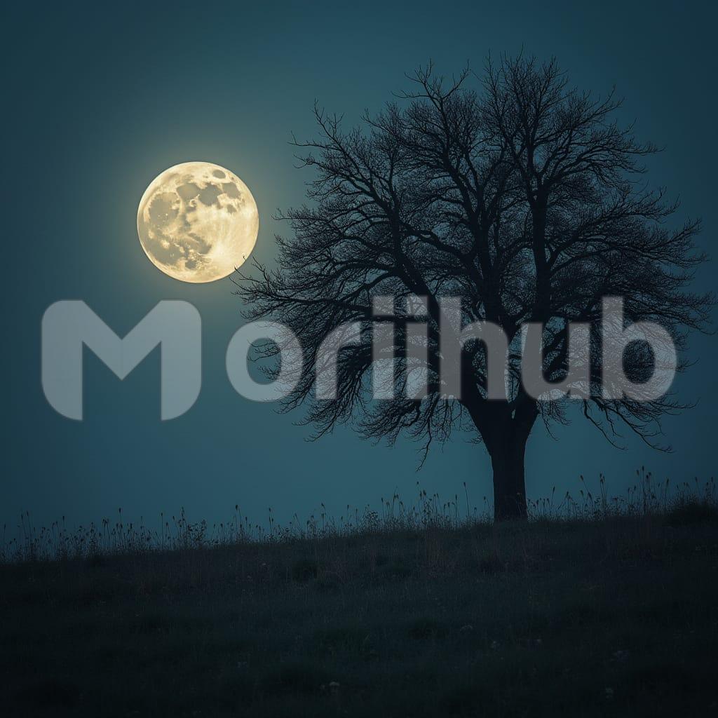 A full moon rises above the apple tree, casting a soft, silvery glow over its branches. The moonlight highlights the rich green leaves and ripened fruit, creating a peaceful, serene scene. The quiet night air carries a sense of calm, as the tree stands silhouetted against the luminous sky.