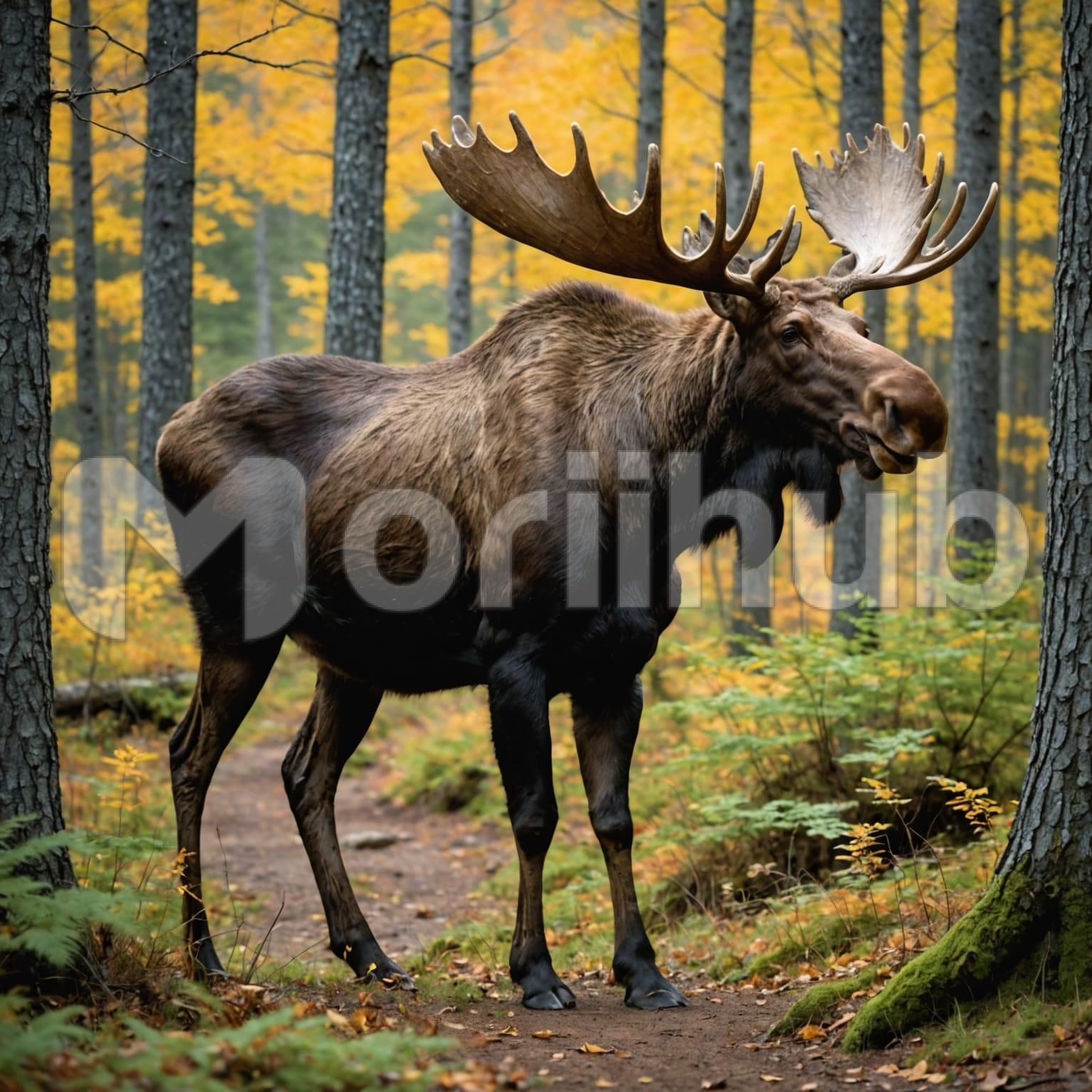 A moose moves through the woods at a steady pace, its large frame passing between tree trunks without hesitation. The ground beneath it is uneven, shaped by time and use. Tall trees rise around it, their trunks forming loose patterns that recede into the distance. The moose’s steps are measured, its head angled forward as if following a quiet trail. There is no urgency in its movement, only a quiet resolve. It continues on, unhurried, a lone figure shaped by its surroundings, steady and certain in its direction.