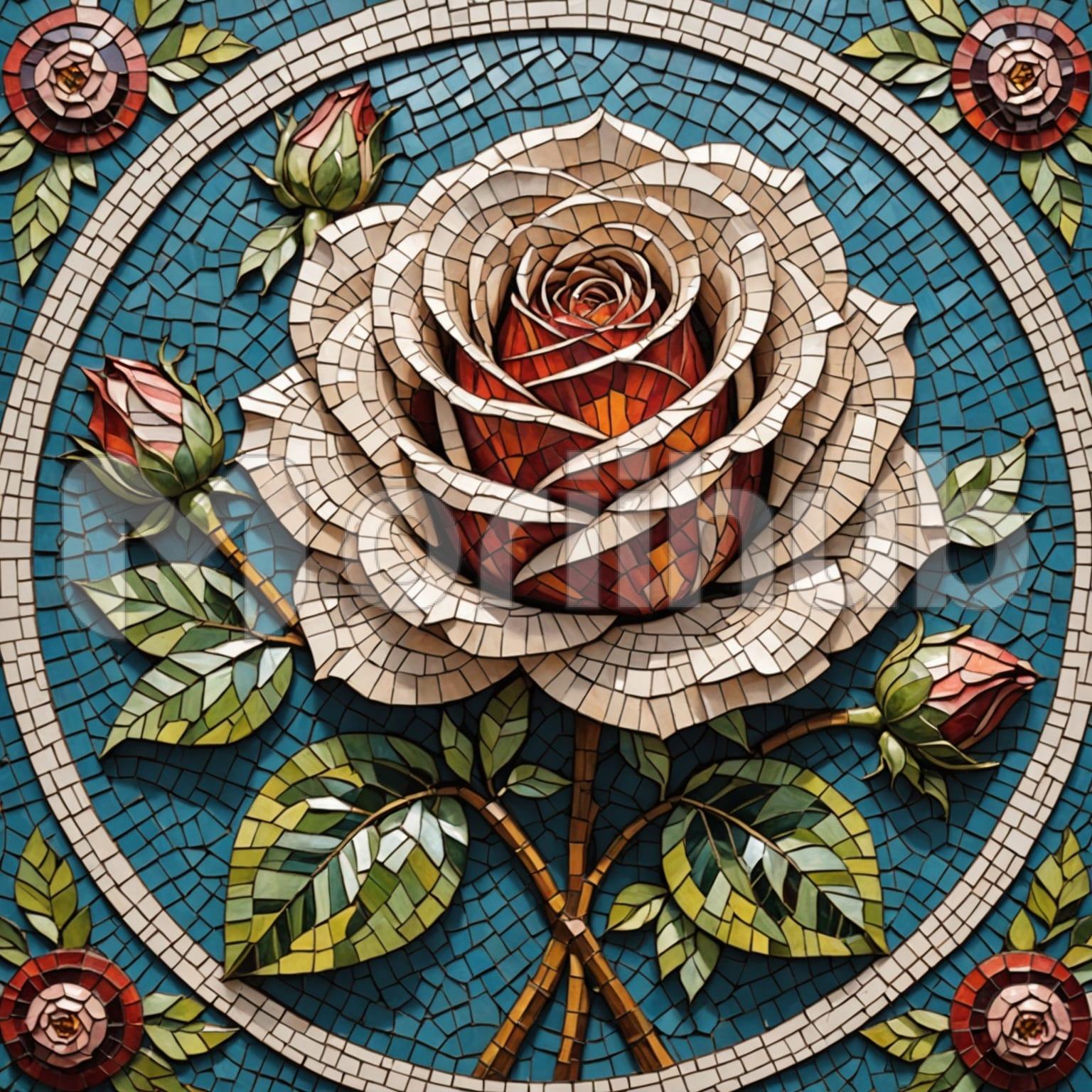 Mosaic art of a rose appears with each piece carefully arranged to shape the bloom’s form. The petals fan outward in a circular rhythm, their curves subtly layered. The pieces used vary in texture and sheen, creating depth as the light shifts across the surface. The rose dominates the composition, isolated and bold, with no surrounding elements to distract from its shape. Every shard contributes to the bloom’s definition, from the tight center to the outer edges. It’s a focused floral piece, rendered in a pattern of fragments and quiet symmetry.