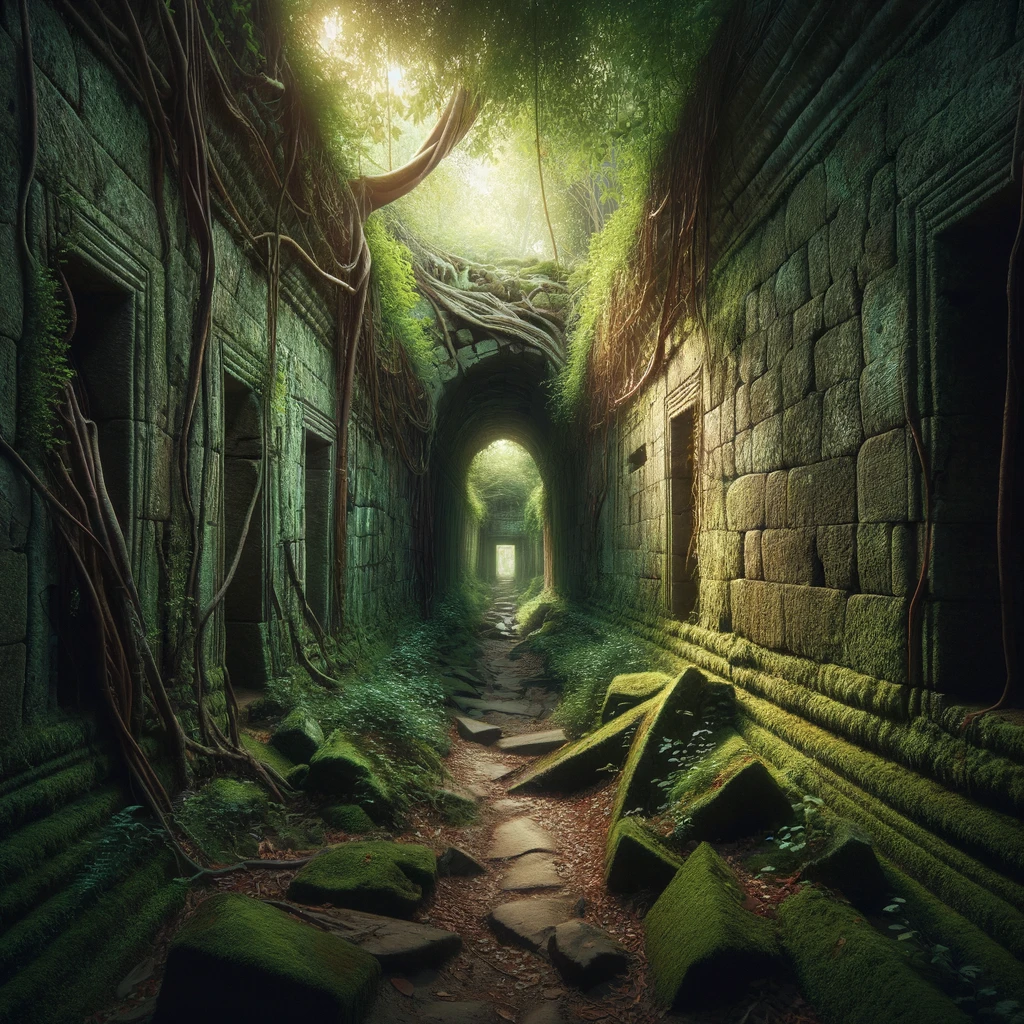 In this captivating scene, an ancient passageway meanders through the ruins of a long-forgotten civilization. The walls, constructed of weathered stone, bear the weight of time and history, their surfaces adorned with intricate carvings and mossy tendrils. Each step unveils echoes of a bygone era, shrouded in mystery and allure.