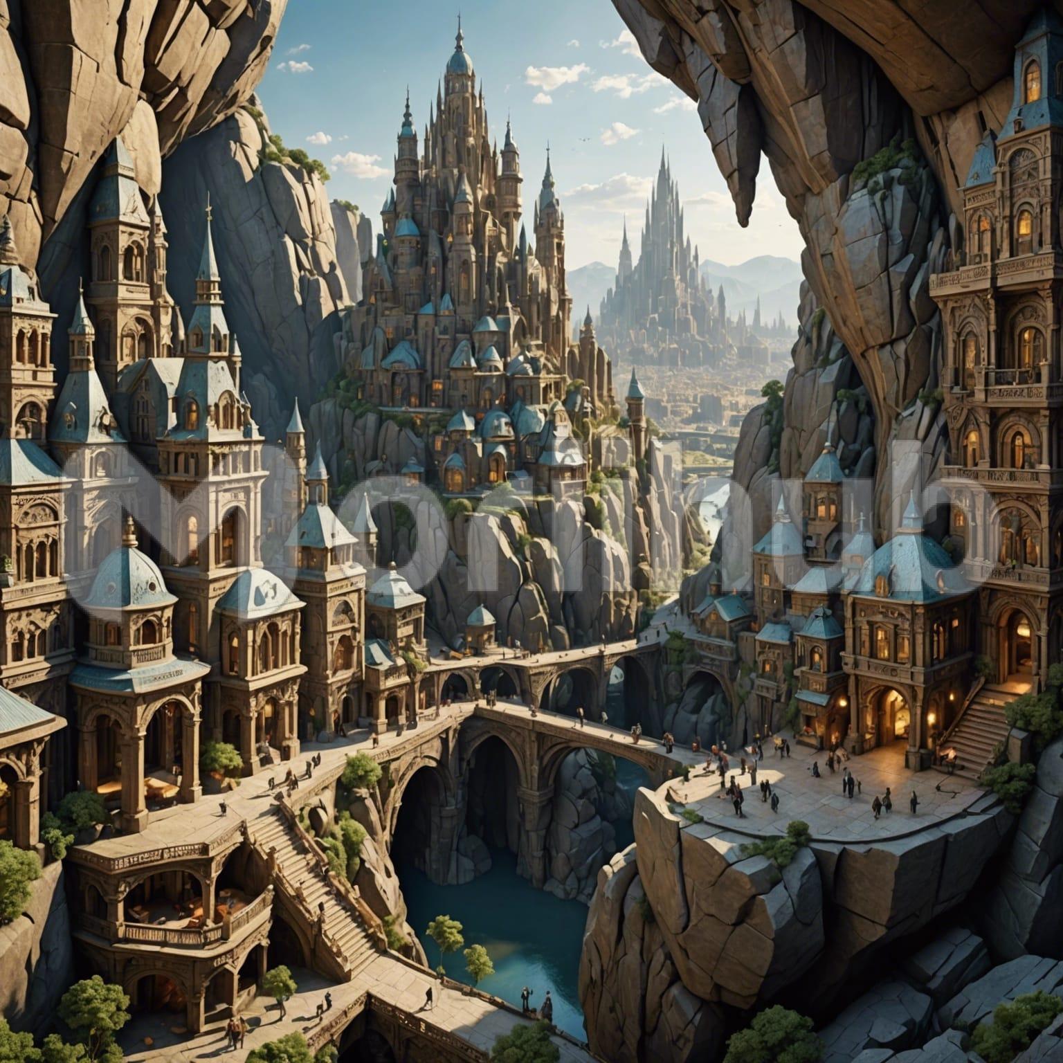 In a bustling metropolis nestled within mountainous terrain, skyscrapers blend seamlessly with the natural landscape, their structures carved into the rock. People traverse winding streets and staircases, their silhouettes weaving through the urban labyrinth. The city hums with activity as crowds bustle along avenues lined with vibrant markets and bustling cafes. From afar, the skyline is a mesmerizing fusion of modern architecture and rugged peaks, a testament to human ingenuity harmonizing with the majestic beauty of nature.