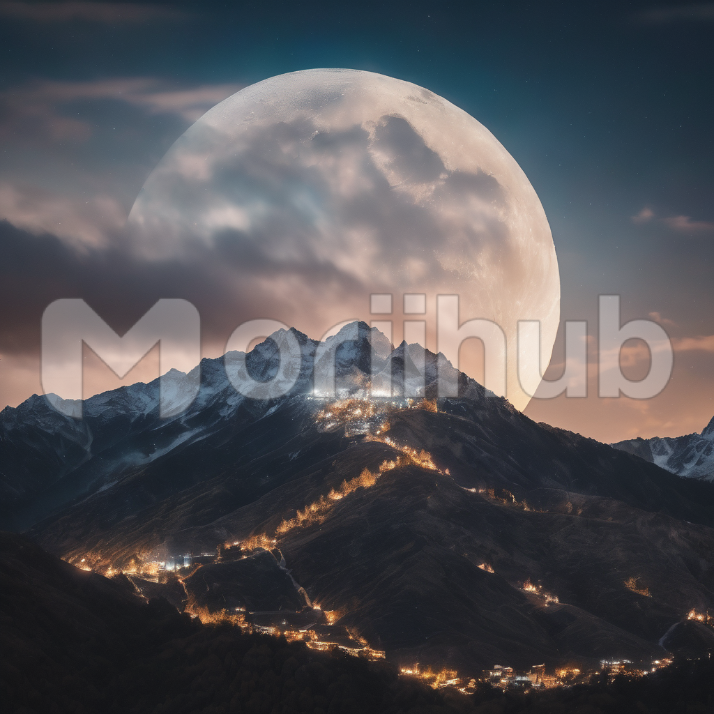 A luminous full moon gracefully ascended behind a majestic mountain, casting an enchanting glow. Silhouetted against the night sky, the mountain’s rugged contours framed the celestial beauty. Below, a city’s twinkling lights dotted the landscape, while lush greenery thrived in the moon’s gentle radiance. The serene scene harmonized the elements of nature and urban life, with the mountain, moon, greenery, and city converging in a captivating nocturnal symphony.