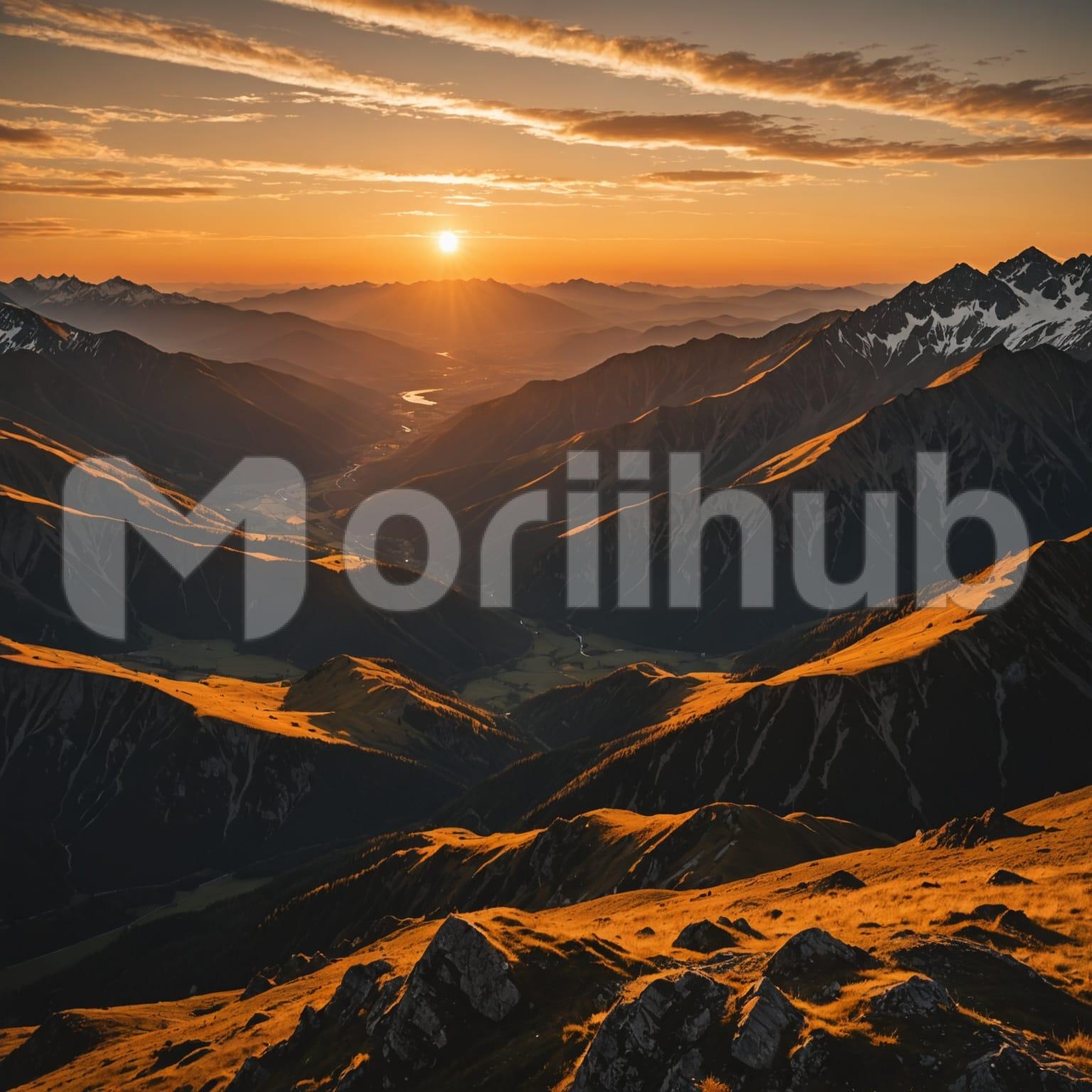 Mountains stretch across the view, their peaks steady and firm against the expanse. At the horizon, sunset lingers, its fading presence marking the close of the day. Above, clouds gather and spread, shaped in broad forms that drift across the sky. The balance of earth and air creates a scene both grounded and vast, with the mountains anchoring the lower span while the sky carries motion and change. Together they form a view defined by quiet strength, distance, and the simplicity of natural contrast.