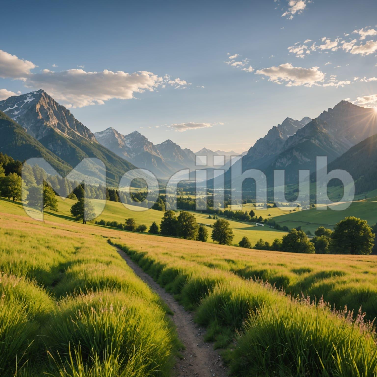 A grassy field stretches out, its surface open and gently rolling toward the horizon. Trees stand ahead, their branches reaching upward, forming a natural barrier between the field and the mountains beyond. The trees vary in size and shape, adding texture to the scene. In the distance, mountains rise with rugged outlines softened by haze, their peaks standing tall against the horizon. The field feels expansive and calm, leading the eye toward the trees and mountains, creating a layered view that blends openness with distant strength.