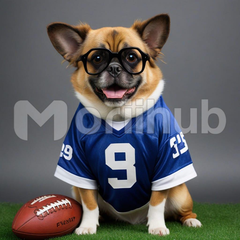 This funny, bold dog struts proudly in a football jersey, its tail wagging with excitement. The jersey, a perfect fit, shows off its sporty style as the dog looks ready to tackle any challenge, bringing smiles to everyone around. With its playful energy and team spirit, this dog is the true MVP!