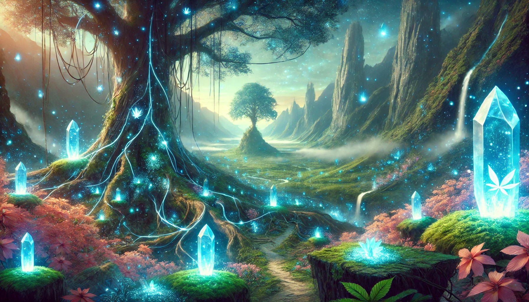 Giant, ancient trees glow softly with bioluminescent leaves, their roots entwined with shimmering crystals that pulse with light. The ground is covered in lush, glowing moss and strange, vibrant flowers that emit soft auras. Floating stones hover above the earth, connected by vines and magical energy. In the distance, towering mountains rise, their peaks surrounded by ethereal mists, and enchanted waterfalls cascade, glowing as they flow into crystal-clear pools.