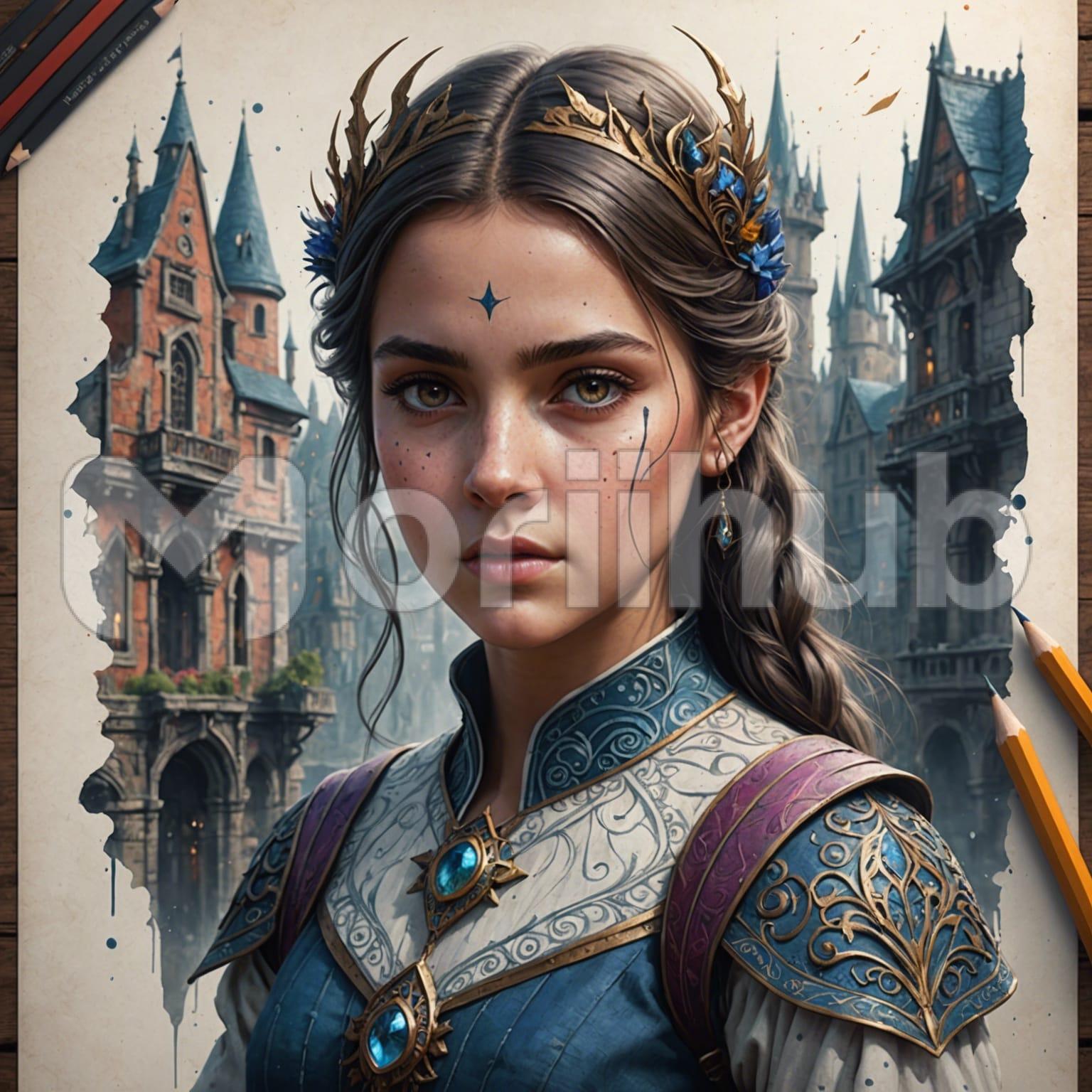 A drawing of a fantasy woman captivates with her ethereal presence. She wears intricately designed clothes, each pattern meticulously detailed to showcase a blend of elegance and fantasy. A shimmering jewel adorns her forehead, adding a touch of mystique and regality to her appearance. Behind her, an array of buildings rise, their unique architecture hinting at a world beyond imagination. The scene is both enchanting and intricate, with the woman’s poised demeanor and the elaborate background creating a harmonious blend of beauty and fantasy.