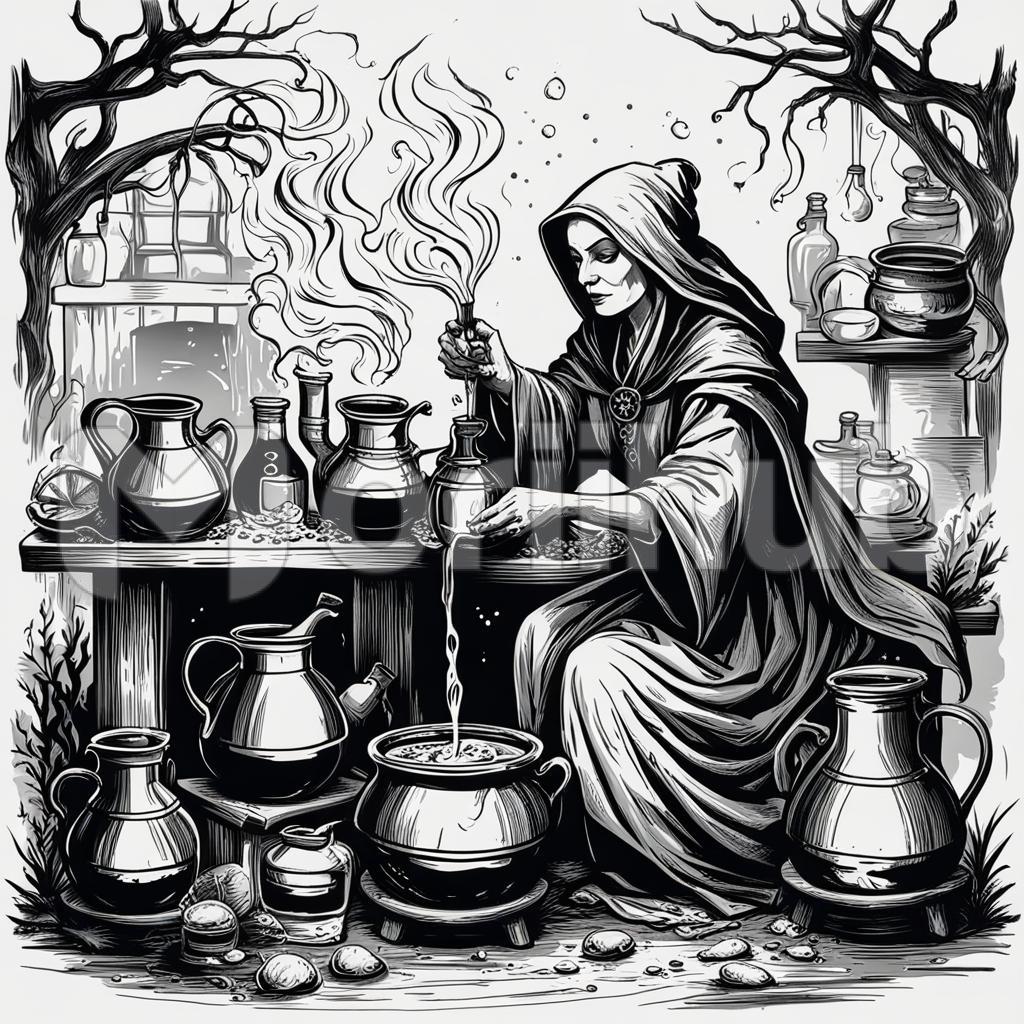A witch, surrounded by an array of arcane bottles, intricately sketches the art of potion brewing. In the dimly lit room, she leans over a bubbling cauldron, stirring with a mystical wand. The shelves are adorned with vials filled with colorful liquids, each labeled with cryptic symbols. The atmosphere exudes an aura of ancient magic, capturing the essence of the enchanting alchemical craft within the captivating sketch.