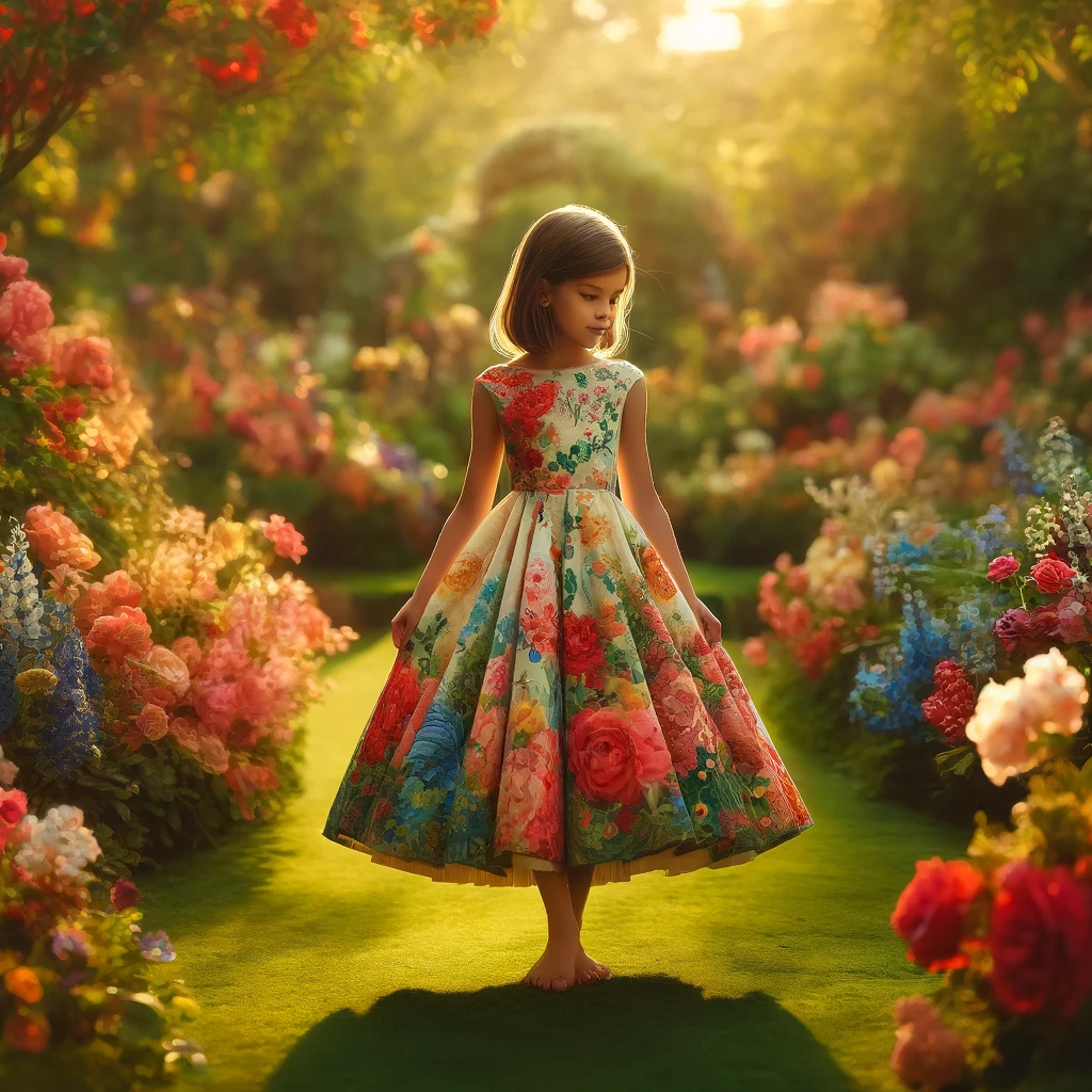 In the tranquil embrace of early morning sunlight, a vibrant garden awakens with hues of green and splashes of colorful blooms. At its heart stands a young girl, about 8 years old, enveloped in the serenity of nature’s awakening. With innocence and wonder, she becomes one with the enchanting beauty that surrounds her.