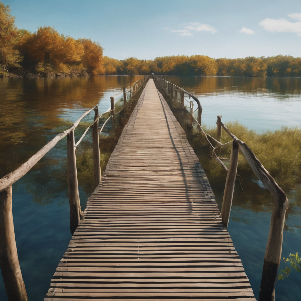 A wooden bridge gracefully spans over tranquil waters, connecting realms with timeless elegance. The rich, earthy tones of the timber harmonize with the natural surroundings, reflecting in the rippling water below. The bridge’s sturdy yet artful construction invites passage, creating a picturesque scene where nature and human craftsmanship intertwine in serene harmony.