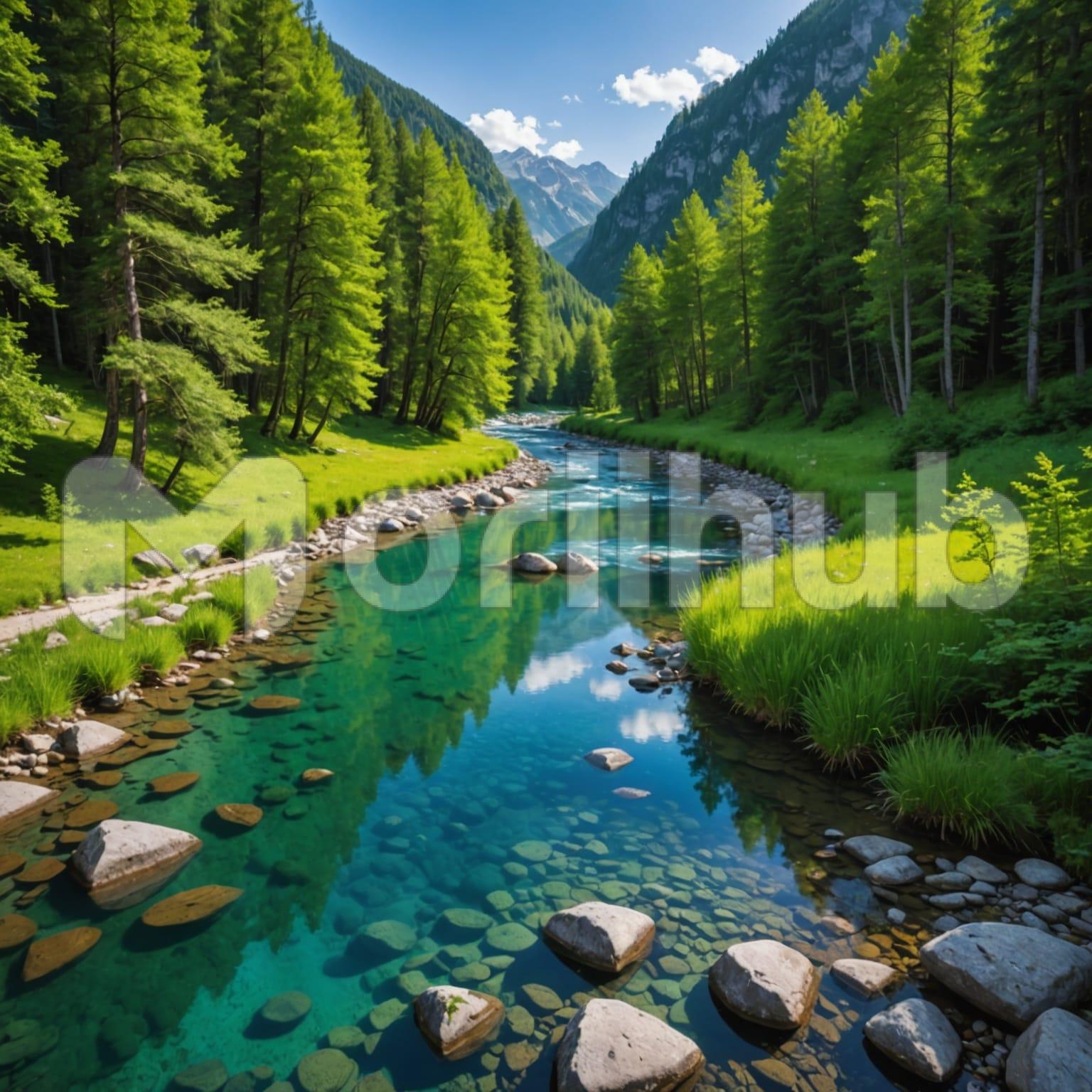 Trees stand on either side of a gently flowing stream, their branches reaching toward each other as if framing the water’s path. The stream reflects hints of the sky, carrying light along its surface. Beyond, mountains rise with quiet strength, their slopes adding depth and scale to the view. Sparse clouds drift slowly overhead, soft shapes against an otherwise open sky. The arrangement of elements feels natural and balanced, with each part—trees, water, mountains, and sky—working together to create a serene and timeless landscape.