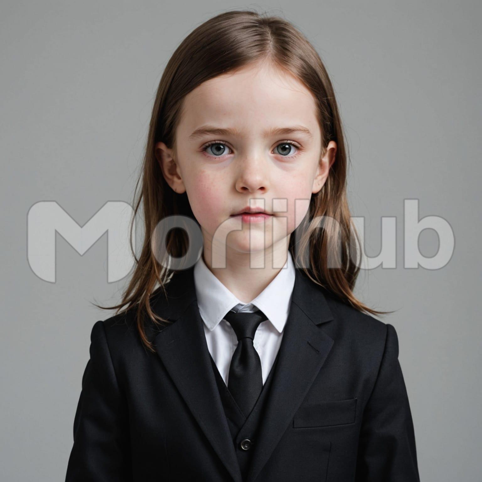 A girl stands in a suit, the fit neat and structured. A bowtie is fastened at her collar, tied evenly. Her short hair is brushed back, adding to the simple, composed appearance. The background is plain, offering no detail beyond her figure. She faces forward, not posing, just present. The suit is clean, its lines clear, and nothing about the outfit appears forced or out of place. There’s no movement, no added flair—only a quiet balance between the formal wear and her steady, unadorned expression.