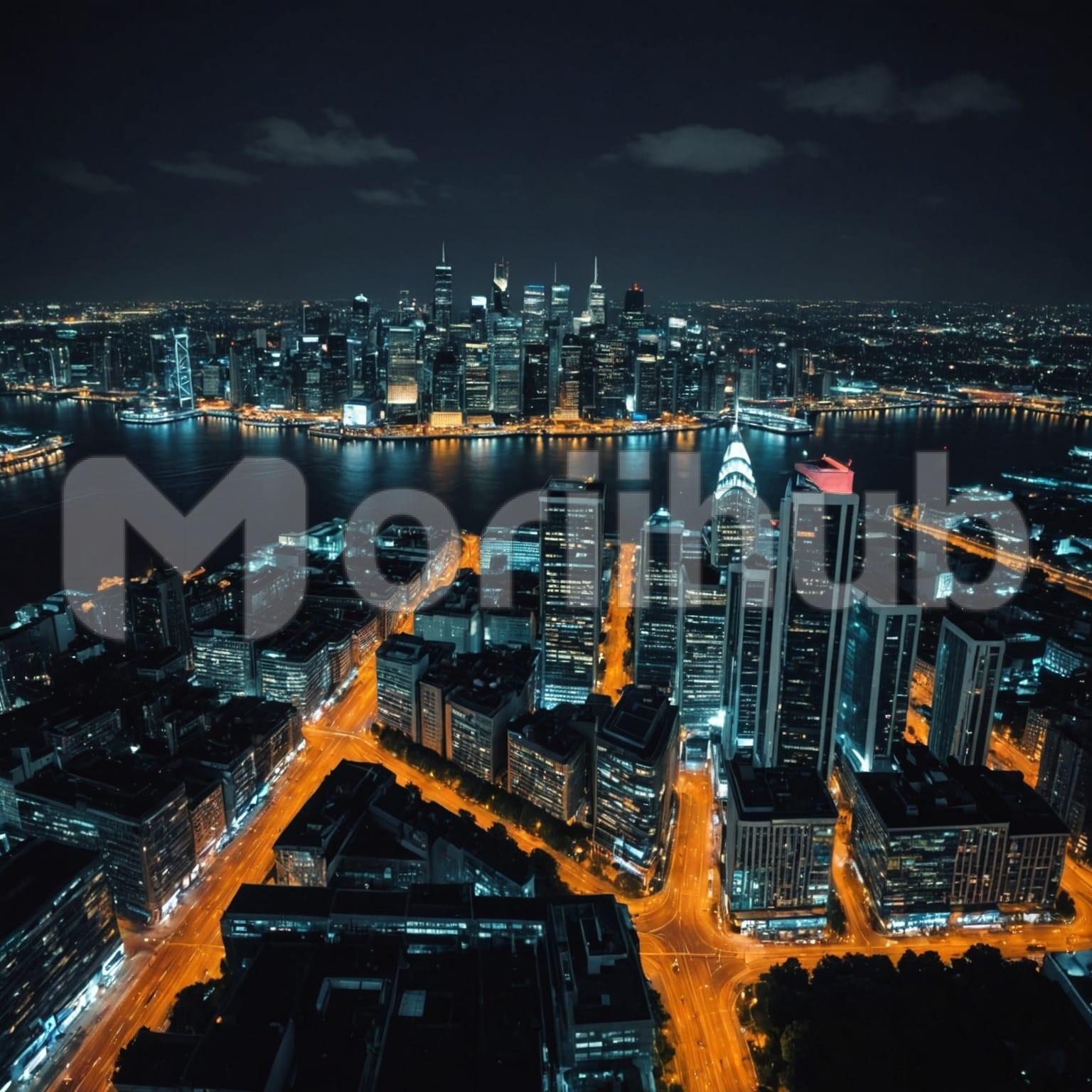 Lights trace the city, outlining buildings in a scattered glow. Structures rise against the dark sky, their windows forming quiet patterns. Rooftops cut an uneven skyline, some marked with faint signals. The city hums with unseen motion, a presence felt in distant glows stretching toward the horizon. Shadows shift between structures, hints of movement lingering in the quiet. The night settles over the city, softening edges while lights flicker in steady rhythm. In the distance, buildings stand, their presence marked only by the glow that persists through the darkness.