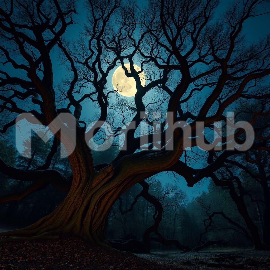 The moon hangs high in the night sky, its pale light casting a calm glow over the landscape. Below, a withered tree stands alone, its bare branches reaching upward as if drawn to the luminous orb. The stark silhouette of the tree contrasts with the smooth, steady brightness of the moon, creating a quiet yet striking scene. The emptiness around them emphasizes their presence, allowing the mind to linger on the simple interplay of light and form. Together, they form a moment of solemn stillness, both haunting and quietly captivating.