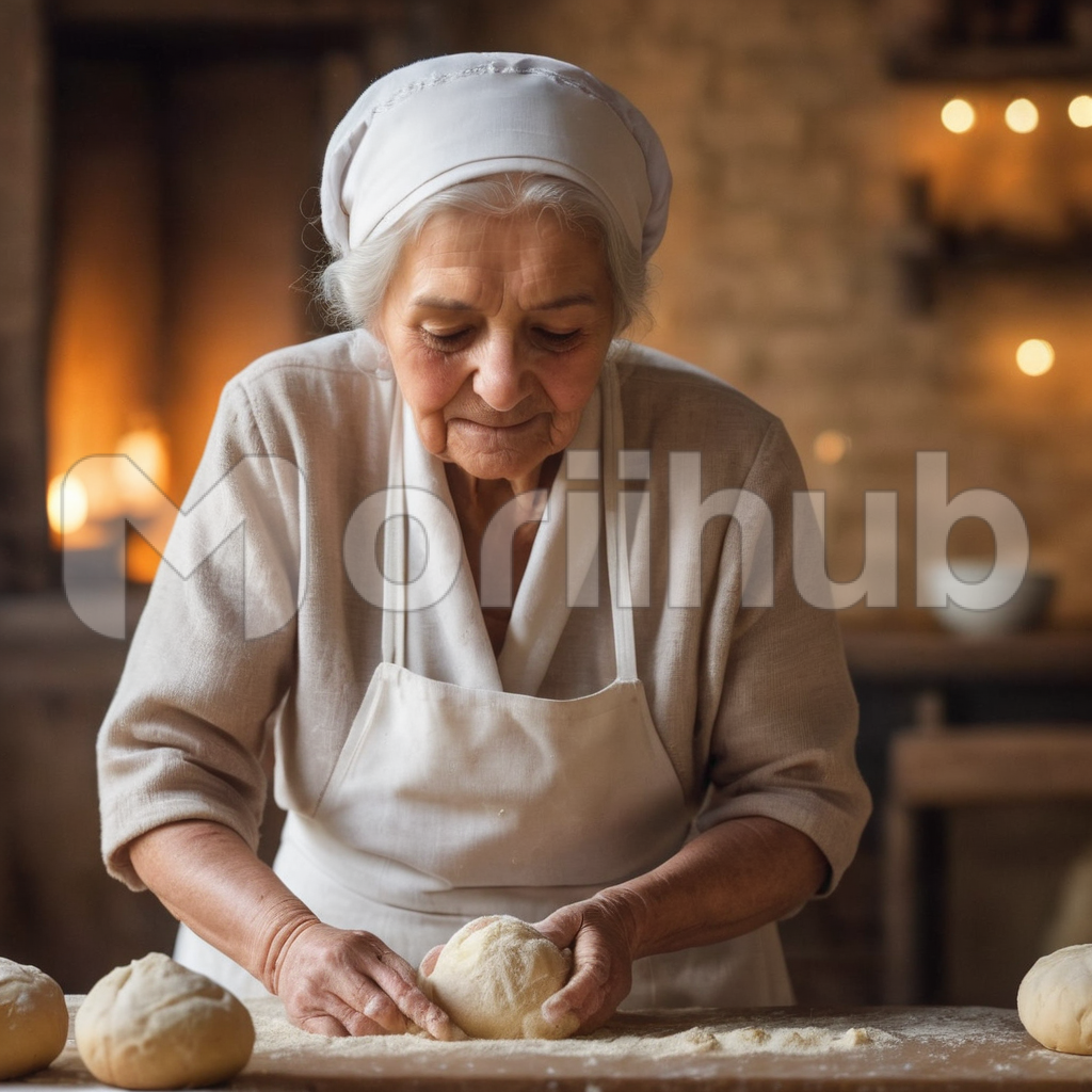 In a cozy kitchen, a beloved granny stands at the worn wooden table, her hands immersed in the timeless art of kneading dough. With gentle expertise, her fingers work the flour and water into a smooth, elastic mass. Each rhythmic press and fold echoes the generations before, a cherished tradition passed down. As she kneads, a warm smile graces her face, embodying the love and nurturing that infuse every loaf she bakes.