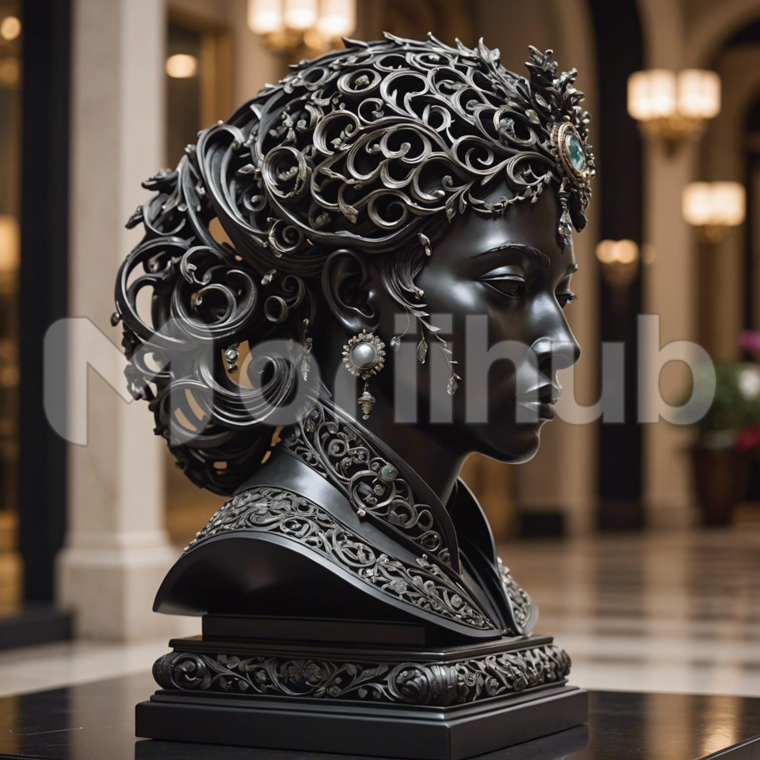 On the stand, a sculpted black bust of a woman stands regal and serene. Carved from obsidian-like material, her features exude timeless elegance and strength. Each curve and line tells a story of resilience and grace, capturing the essence of feminine beauty. Positioned on the stand with precision, she commands attention and admiration. In her stoic gaze, there is a sense of wisdom and dignity, inviting contemplation and reverence. She is a symbol of power and poise, a testament to the enduring spirit of womanhood.