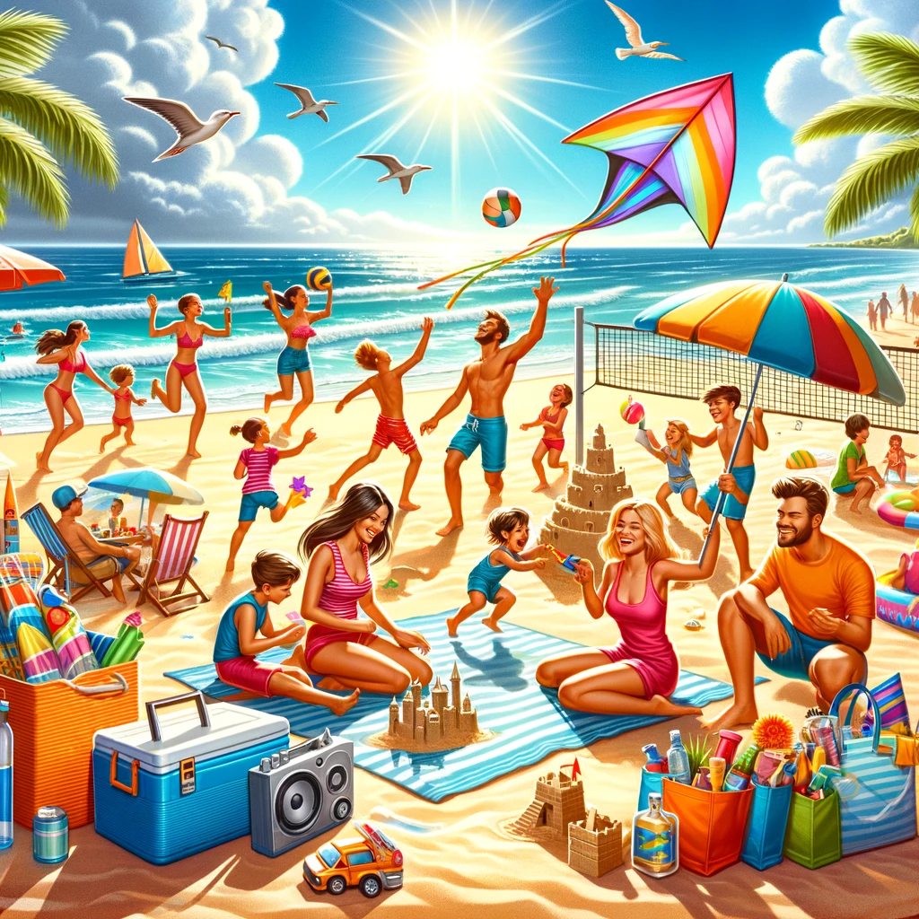 Beneath the radiant sun, a vibrant beach scene unfolds, alive with energy and joy. Against the backdrop of clear blue skies and gentle sea waves, families and friends gather for a day of fun. Some build towering sandcastles, while others play beach volleyball or frolic in the surf. Children laugh as they chase seagulls, and beachgoers soak up the sun’s warm embrace. Amidst the colorful umbrellas and towels, the atmosphere is one of relaxation and camaraderie, a perfect day by the sea.