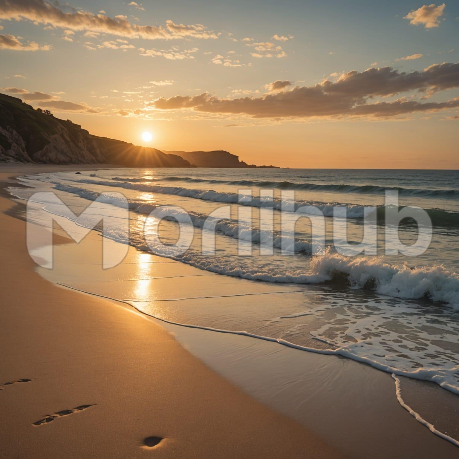 A vast ocean stretches ahead, its surface moving in calm waves that travel gently toward the beach. At the horizon, the sunset rests low, creating a striking divide between water and sky. Off to one corner, a strip of land emerges, grounding the scene with subtle presence. Above, clouds drift across, scattered and layered, softening the expanse overhead. The composition feels balanced, with each element—ocean, horizon, land, and sky—holding its place in quiet harmony. It is a serene, reflective view, steady and composed.