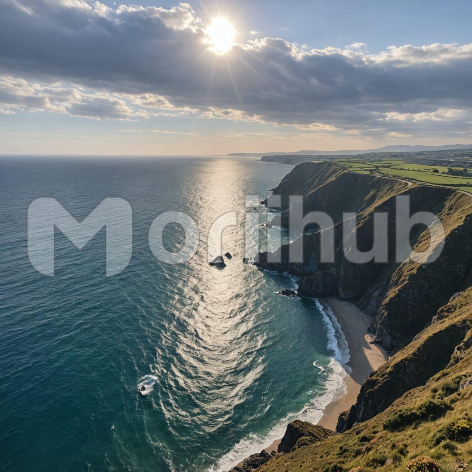 A vast expanse of the open sea stretches toward the horizon, its surface shifting with gentle motion. Wisps of clouds drift across the sky, scattered above the water. The sun hangs high, casting light over the scene. In the corner, a stretch of land emerges, its contours faint against the distance. The meeting of sea and sky creates a sense of openness, where the elements blend seamlessly. The view captures the quiet movement of nature, with the sky and water stretching endlessly beyond sight.