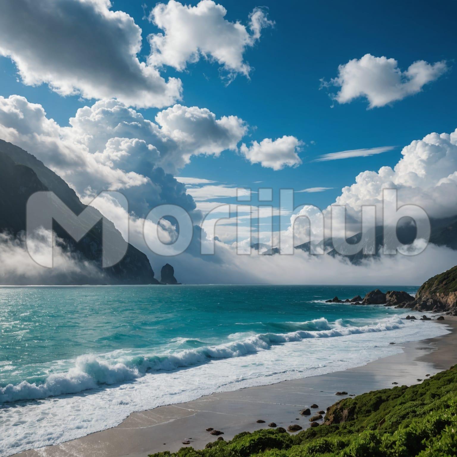 The tides sweep across the beach with rhythmic precision, the waves rolling in and out with a gentle roar. Each wave leaves a temporary, glistening trail on the wet sand before retreating. The sky above is adorned with wisps of clouds, drifting slowly and subtly across the expanse. Their delicate forms contrast with the power of the ocean below. The scene is one of calm and motion, where the ceaseless dance of the tides meets the serene drift of the clouds, creating a harmonious coastal landscape.